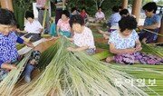 전남 함평군 월야면 용월리 외세마을 노인들이 18일 마을 정자에 모여 앉아 왕골 돗자리를 짜고 있다. 외세마을 주민들은 수확한 왕골의 껍질을 벗겨 전통방식으로 공예품을 만들고 있다. 박영철 기자 skyblue@donga.com}
