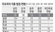 지난달 공직선거법 개정안 통과로 선거 가능 연령이 만 18세까지 확대됐다. 고등학교 3학년 학생 약 14만 명이 4월 총선에서 투표권을 행사한다. 하지만 이들은 아직 성인이 아니다. 민법상 성인의 나이는 만 19세로 변동이 없다. 성인 연령과 선거 연령이 다른 국가는 흔치 않다. 지난달 법무부가 해외 주요 국가들의 성인 및 선거 연령을 조사한 결과를 보면 우리나라는 이례적인 경우다. 한국 일본 중국 미국 영국 프랑스 독일 이탈리아 캐나다 러시아 10개국 2020년 기준으로 성인 연령과 선거 연령이 다른 나라는 한국과 일본뿐이다. 나머지 8개 나라는 만 18세부터 성인으로 인정하는 동시에 선거권을 부여한다. 일본도 현재는 성인 연령이 20세, 선거 연령이 18세로 다르지만 민법 개정에 따라 2022년 4월부터 성인 연령도 18세로 조정된다. 음주와 흡연을 할 수 있는 나이도 일반적으로 성인 연령과 연계돼 있다. 영국과 러시아, 중국은 모두 성인 연령인 만 18세부터 술을 마시고 담배를 피울 수 있다. 프랑스와 독일은 알코올 도수가 높은 증류주는 만 18세부터, 맥주나 와인은 만 16세부터 마실 수 있다. 이탈리아는 성인 연령보다 어린 만 16세부터 음주와 흡연을 허용하고 있다. 소년법이나 국민투표도 성인·선거 연령과 궤를 같이한다. 영국 프랑스 이탈리아 캐나다 러시아 등 5개 국가는 성인 연령인 만 18세부터 소년법 대신 성인과 같은 형사법의 적용을 받는다. 국민투표권도 만 18세부터 부여한다. 이에 따라 우리나라도 성인 연령과 선거 연령을 유기적으로 검토해야 한다는 주장이 나온다. 김기수 변호사는 “해외 국가가 만 18세부터 성인으로 인정하고 선거권을 주는 이유는 우리와 학령제가 달라 대학에 일찍 들어가기 때문이다. 성인 나이에 대한 공론화 없이 선거 연령만 낮춘 것은 잘못”이라고 주장한다. 반면 김예림 변호사는 “성인 연령과 선거 연령이 다르다고 해서 법리적으로 충돌할 우려는 없다”면서도 “다만 고3 학생이 선거법을 위반해 형사 처벌될 위험이 생기는 것 등은 생각해볼 문제”라고 말했다. 교육계에서는 선거권 부여가 성인 인정으로 연결돼 음주나 흡연을 둘러싼 논란을 부를 수 있다는 주장이 나온다. 김경회 성신여대 교육학과 교수는 “선거 연령을 낮춘 건 고3 학생들의 판단 능력이 성인만큼 성숙했다고 인정해준 셈이다. 학생들 사이에서 음주나 흡연에 대한 요구도 자연스럽게 생겨날 것”이라고 우려했다. 반면 박주호 한양대 교육학과 교수는 “당장 학교에서 학생들이 술을 마시게 해달라는 주장까지 나올지는 모르겠지만 민법 개정에 대한 요구는 나올 수 있을 것”이라고 말했다.강동웅 기자 leper@donga.com}