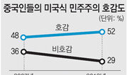 중국인 절반 이상은 미국식 민주주의를 긍정적으로 생각하는 것으로 나타났다. 그러나 미국과의 관계는 악화되고 있다고 보는 중국인이 늘고 있는 것으로 조사됐다. 16일 미국 여론조사업체 퓨리서치에 따르면 올해 3, 4월 중국인 3177명을 대상으로 실시한 설문조사 결과 응답자의 52%가 미국식 민주주의를 선호하고 있다고 답했다. 미국식 민주주의에 대한 호의적 의견은 18∼29세의 젊은 연령대에서 가장 높았다. 반면에 미국식 민주주의에 비호의적 의견은 29%였다. 5년 전인 2007년 조사보다 호감은 4% 늘었고 비호감은 7% 줄었다. 미국이 세계 경제를 이끌어나가고 있다는 응답도 48%로 중국이 세계 경제를 이끌고 있다는 응답(29%)보다 훨씬 많았다. 2009년 조사에서는 미국과 중국이 41%로 똑같았다. 그러나 이번 조사에서 미중 관계가 협력적이라고 답한 중국인은 39%로 2010년 68%에서 29%포인트 줄었다. 버락 오바마 미국 대통령의 외교정책에 대한 신뢰도도 2010년 52%에서 38%로 14%포인트나 하락했다. 다음 달 8일 열리는 중국 공산당 제18차 당대회를 앞두고 나온 이번 조사결과는 중국 당국자들에게 시사점을 줄 것이라고 월스트리트저널이 이날 전했다. 중국 경제가 아주 좋은 상황이라고 답한 응답자는 83%였다. 응답자의 70%는 최근 5년간 가족생활이 개선됐다고 답했다. 물가 상승이 문제라고 답한 응답자는 92%였다. 관리의 부패가 심각하다는 응답자도 2008년 11%에서 50%로 늘었다. 식품 안전에 대한 우려는 2008년 13%에서 33%로 높아졌다.워싱턴=정미경 특파원 mickey@donga.com}