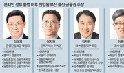 차기 우리은행장과 은행연합회장의 인선이 마무리 단계에 접어들며 현 정부의 금융권 인사에 대한 밑그림이 드러나고 있다. 하마평에 오른 유력 인사를 제치고 무난하고 ‘뒷말’이 적은 후보가 속속 금융권 수장을 꿰차고 있다. 현 정부와 연이 닿아 있는 부산 출신 인사의 약진도 두드러진다. 28일 금융업계에 따르면 은행연합회는 27일 김태영 전 농협중앙회 신용대표이사를 차기 은행연합회장 단독 후보로 선정했다. 29일 예정된 사원총회를 무난히 통과할 것으로 보여 사실상 차기 은행연합회장으로 내정된 셈이다. '당초 은행연합회장 유력 후보로' 점쳐졌던 인물은 홍재형 전 경제부총리와 김창록 전 산업은행 총재, 신상훈 전 신한금융지주 사장이었다. 15일 열렸던 이사회에서도 이들은 주요 후보로 이름을 올렸다. 하지만 일부 후보가 최근 정치자금법 위반 혐의로 벌금형을 선고받고 ‘올드보이’ 귀환에 대한 부정적 여론이 대두되면서 기류가 급변했다. 금융권 관계자는 “흠이 별로 없고 금융권 인사들과 두루 잘 지내는 성품이 높은 평가를 받은 것 같다”고 전했다. 현 정부 출범 이후 부산을 연고지로 하는 인사들이 금융권 요직을 차지하고 있다는 분석도 나온다. 부산 출신 금융인들은 지난해 상반기 사교모임인 ‘부금회’를 만들어 친목을 도모해 온 것으로 알려졌다. 김 내정자는 부산 출생으로 영남상고와 명지대를 졸업했다. 문 정부 출범 이후 금융권 수장이 된 부산 출신 인사는 정지원 한국거래소 이사장, 김지완 BNK금융지주 회장 등이다. 이동빈 Sh수협은행장은 강원 평창 출신이지만 부산대 경영학과를 졸업하고 우리은행 부산경남동부 영업본부장을 맡아 광의의 부산 인맥으로 통한다. 김 내정자를 포함해 모두 유력한 후보를 물리치고 ‘깜짝’ 발탁됐다는 공통점도 갖고 있다. 최근 최종 면접후보가 정해진 우리은행 역시 무난한 인선을 지향했다는 평가가 많다. 우리은행은 지난달 국회 정무위원회 국정감사 과정에서 특혜채용 의혹이 불거지며 이광구 우리은행장이 사임하는 등 내홍을 겪었다. 우리은행 내부에서는 연초 이 행장의 연임 과정에서 경쟁했던 내부 출신 인사가 이 행장에게 타격을 주기 위해 특혜채용 사실을 외부에 흘렸을 것이라는 지적이 끊이질 않았다. 게다가 28일에는 특혜채용과 관련해 서울 중구 회현동 본점과 마포구 상암동 전산센터를 압수수색 당했다. 10월 국감 이후 3번째 압수수색이다. 이 때문에 금융권에선 “우리은행 임원후보추천위원회가 가급적 내부 동요를 일으키지 않는 쪽으로 행장 후보를 정할 것”이란 말이 나돌았다. 연초 이광구 행장과 경쟁했던 특정 후보들이 모두 낙마할 가능성이 크다는 것이었다. 결국 임추위는 현재 행장 직무대행을 맡고 있는 손태승 글로벌부문장과 면접에서 높은 점수를 받은 것으로 알려진 최병길 삼표시멘트 대표를 최종 후보로 선정했다. “조직 안정화를 위해 공정하고 신속하게 행장 후보를 정했다”는 설명도 곁들였다. 생명보험협회는 30일 2차 회장후보추천위원회에서 차기 회장의 윤곽이 드러날 것으로 보인다. 양천식 전 수출입은행장, 박창종 전 생보협회 부회장, 진영욱 전 한국투자공사 사장, 유관우 전 금감원 부원장보 등 관료 출신 인사가 하마평에 오르고 있다. 하지만 은행연합회와 마찬가지로 관료 출신이 아닌 제3의 인물이 부상할 가능성도 있다. 한편 IBK투자증권 신임 대표에는 김영규 전 IBK기업은행 IB그룹 부행장(57)이 내정됐다. IBK투자증권은 29일 이사회에서 김 전 부행장을 단독 후보로 추천할 예정이다. 김 전 부행장은 1979년 기업은행 입행 후 인천지역본부장 등을 지냈다. 당초 금융권에선 올해 대통령선거에서 더불어민주당 금융제도개선특별위원장을 맡았던 대학 교수가 유력하게 거론돼 왔다.송충현 balgun@donga.com·김성모 기자}