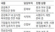 정홍원 국무총리가 지난해 말까지 풀겠다고 밝힌 대표적인 규제 7건 중 4건이 아직도 남아 있는 것으로 나타났다. 남아 있는 규제 대부분은 국회까지 가지 않고 정부 내에서 해결할 수 있는 규제여서 “일선 부처의 규제 개혁 실천 의지가 대통령의 생각을 쫓아가지 못한다”는 비판이 나온다. 박근혜 대통령은 5일 “규제 개혁은 꿈까지 꿀 정도로 생각을 하고 계속 관심을 가져야 한다”고 강조한 바 있다. 정 총리는 지난해 8월 국가정책조정회의에서 기업 활동을 막는 규제 1650건을 ‘이것만 허용한다’는 포지티브 방식에서 ‘이것만 안 된다’는 네거티브 방식이나 그와 유사한 수준으로 대폭 손질하겠다고 밝혔다. 이에 따라 국무조정실은 대표 사례 21건을 개선 시기와 함께 발표했다. 하지만 13일 동아일보가 지난해 말까지 풀기로 했던 규제 7건을 확인한 결과 실제 풀린 건 3건에 불과했다. 해당 부처는 ‘실효성이 없을 것 같아서’, ‘바빠서’ 등 어처구니없는 이유를 댔다. 문화체육관광부는 당시 “외국인 관광객 유치 및 지역경제 활성화에 이바지하겠다”며 관광특구 지정 요건을 ‘휴양 오락시설 2종류 이상’에서 ‘1종류 이상’으로 바꾸겠다고 했다. 하지만 이를 위해 필요한 관광진흥법 시행규칙 개정 작업은 전혀 진전이 없다. 문체부 관계자는 이에 대해 “전임 담당자가 추진하던 일인데 규제를 완화한다고 얼마나 관광객 유치에 도움이 될지 모르겠다”고 말했다. 식품의약품안전처는 지난해 6월까지 한시적으로 허용된 관광특구 내 음식점 옥외영업을 전면 허용하기 위해 식품위생법 시행규칙을 바꾸겠다고 했다. 하지만 시행규칙이 아직 안 바뀐 탓에 상당수 음식점이 반년 넘게 불법 옥외영업을 하고 있다. 식약처 관계자는 “다른 업무가 많아 미처 신경을 못 썼다”고 말했다. 산업통상자원부는 중소기업의 자유무역지역 입주를 늘리기 위해 입주 자격을 ‘최근 3년간 매출 대비 수출액 50% 이상’에서 ‘수출액 30% 이상’으로 완화하겠다고 했다. 하지만 협의가 덜 된 상태에서 발표해 일부 부처가 반발했고 최근에야 ‘중소기업은 수출 비중 30% 이상, 중견기업은 수출 비중 40% 이상’으로 바꿔 시행령 입법예고에 들어갔다. 미래창조과학부는 전송망 사업 진입 요건을 네거티브 방식으로 바꾸기 위해 지난해 12월 법안을 국회에 제출했지만 아직 한 번도 논의되지 않은 채 계류 중이다. 규제 완화 약속이 제대로 이행되지 않은 4건 중 3건은 정부 내에서 고칠 수 있는 시행령 및 시행규칙 개정 사항이다. 국무조정실 관계자는 “전체적으로는 지난해 말까지 목표했던 153건 중 115건(75.2%)을 개정했다”고 해명했다.장원재 기자 peacechaos@donga.com 홍유라 인턴기자 성균관대 신문방송학과 4학년}