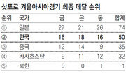 한국이 2017년 삿포로 겨울아시아경기에서 2003년 아오모리 대회 이후 14년 만에 종합 2위에 복귀했다. 한국은 25일 피겨스케이팅 여자 싱글의 최다빈(17·군포 수리고)과 스키 알파인 남자 회전의 정동현(29·하이원)이 금메달을 추가해 역대 최다인 16개의 금메달을 획득했다. 한국은 26일 은메달 3개를 추가해 금메달 16개, 은메달 18개, 동메달 16개를 기록해 일본(금 27, 은 21, 동메달 26개)에 이어 종합 2위에 올랐다. 중국(금 12, 은 14, 동메달 9개)이 3위를 했다. 남자 아이스하키 대표팀은 역대 최고 성적인 은메달을 차지했다. 백지선 감독(50)이 이끄는 한국은 26일 쓰키사무체육관에서 3골, 2도움을 기록한 신상훈(24·안양 한라)을 앞세워 중국을 10-0으로 대파했다. 카자흐스탄에 0-4로 완패했던 한국은 일본을 4-1로 꺾으며 상승세를 탔고 이날 중국까지 잡아 2승 1패로 대회를 마쳤다. 이날 일본을 7-0으로 완파한 카자흐스탄이 3승으로 금메달을 차지했다. 최재우(23·한국체대)는 스키 프리스타일 모굴 남자에서, ‘철녀’ 이채원(36·평창군청)이 스키 크로스컨트리 여자 15km 매스 스타트에서 은메달을 각각 추가했다. 한국은 전통의 ‘메달 밭’인 스피드스케이팅(금 6개)과 쇼트트랙(금 5개)에서 선전했고, 스키에서 금메달 4개, 피겨에서 사상 첫 금메달을 따내며 역대 최다 금메달을 수확했다. 한국은 11개 세부종목 모두에서 메달을 획득했다. 한편 북한은 피겨 페어에서 렴대옥-김주식 조(대성산 체육단)가 동메달을 따내 메달 1개로 대회를 마쳤다. 삿포로=유재영 기자 elegant@donga.com}