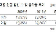 50대 이상 중장년층의 창업 증가율이 청년 창업 증가율의 2배가 넘는 것으로 나타났다. 기업에서 은퇴한 중장년층 대다수가 뚜렷한 노후 대비를 하지 않다 보니 ‘생계형 창업’으로 몰리고 있다는 분석이 나온다. 4일 통계청에 따르면 지난해 50대 이상이 만든 신설 법인은 3만3639곳으로 집계됐다. 이는 관련 통계를 작성하기 시작한 2008년(1만3561곳)보다 148.1% 늘어난 규모다. 반면 창업자의 나이가 만 39세 이하인 신설 법인 수는 2008년 1만5778곳에서 2016년 2만6945곳으로 70.8% 증가하는 데 그쳤다. 지난해 50대 이상 중장년층이 창업한 건수는 청년층 창업보다 6694건 더 많았다. 이처럼 청년 창업보다 중장년층 창업이 더 빠르게 늘고 있는 이유는 직장을 그만둔 50대 이상 중장년층이 새로운 일자리 대신 음식점, 숙박업 등 자영업을 택하고 있기 때문이다. 지난해 하반기(7∼12월) 50대 이상 자영업자는 17만4000명이 늘어 전체 자영업자 증가(19만 명)의 92%를 차지했다. 특히 50대 이상 창업 중 직원을 1명도 두지 않은 비고용 자영업자가 69%에 달했다. 2015년 기준 한국의 자영업자 비중은 21.4%로 경제협력개발기구(OECD) 회원국 중 네 번째로 높았다. 박승호 국회예산정책처 경제분석관은 “경쟁력 확보가 쉽지 않은 음식점 등의 자영업으로 진출하는 경우가 늘어나는 것은 가계부채 증가로 인한 위험을 높이고 고용의 질에 부정적인 영향을 미칠 수 있다”고 지적했다. 이어 “금융기관의 대출 심사 기능을 강화하고 컨설팅이나 교육 지원 등을 통해 사업 경쟁력을 높일 수 있는 방안을 검토할 필요가 있다”고 덧붙였다. 전체 신설 법인에서 만 39세 이하 청년층이 만든 신설 법인이 차지하는 비중은 감소하는 모습을 보이고 있다. 2008년 전체 신설 법인에서 만 39세 이하인 창업자가 새로 세운 법인 비중은 31%였지만 2011년 28.7%, 2015년 27.1%까지 줄어들었다. 지난해에는 0.9%포인트 올라 28.0%로 소폭 상승했다.세종=박희창 기자 ramblas@donga.com}