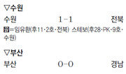 올 시즌 K리그 상위권에서 이어지는 ‘징크스’가 팬들의 관심을 끌고 있다. 11일 수원월드컵경기장에서 열린 K리그에서 수원이 ‘전북 징크스’ 탈출에 실패했다. K리그 A그룹 3위인 수원은 후반 28분 터진 스테보의 페널티킥 덕분에 2위 전북과 1-1로 간신히 무승부를 기록했다. 2008년 9월부터 무려 12경기(5무 7패) 동안 전북을 상대로 이기지 못했다. 올 시즌에는 전북에 3패 끝에 간신히 무승부를 기록했다. 수원으로선 전북만 만나면 ‘고양이 앞에 쥐 신세’인 셈이다. 수원은 최근 단독 선두 서울에는 2010년 8월부터 7경기 연속 무패(6승 1무)의 우세를 지키고 있다. 서울은 4일 1-1로 간신히 비기며 FA컵을 포함해 수원전 7연패에서 탈출할 정도로 수원 앞에만 서면 약해지고 있다. 전북은 이날 후반 11분 오른쪽 미드필드에서 에닝요가 찬 프리킥을 임유환이 골지역 왼쪽에서 달려들며 다이빙 슛해 선제골을 잡아 ‘수원 킬러’임을 보여주는 듯했다. 하지만 전북은 후반 28분 심우연이 수원 스테보를 상대로 하지 않아도 될 파울을 하며 페널티킥을 내주는 바람에 다잡은 승리를 놓쳤다. 전북과 수원이 ‘사이좋게’ 비기는 사이 이날 경기가 없었던 서울만 웃었다. 승점 81인 서울은 승점 1을 추가한 전북(승점 77)에 4점차로 앞선 가운데 10일 아시아축구연맹(AFC) 챔피언스리그 결승 일정상 15일로 미뤄진 5위 울산을 상대로 선두 굳히기에 들어간다. B그룹에서는 ‘강등권’으로 내몰린 강원과 광주가 1-1로 승부를 가리지 못했다. 내년 시즌부터 상주 상무와 함께 리그 15위도 2부로 떨어지는 가운데 강원과 광주는 승점 2점차로 14위(승점 39), 15위(승점 37)를 달리고 있다. 이날 두 팀 중 한 팀이라도 졌다면 탈락이 유력시될 수 있었다. 광주가 후반 10분 이승기의 선제골로 앞섰지만 강원은 7분 뒤 곧바로 오재석의 동점골로 승부를 원점으로 돌렸다. 한편 이날 경기는 1-1로 비긴 포항-제주 경기를 포함해 6경기 모두가 비겼다.양종구 기자 yjongk@donga.com}