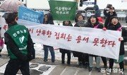 21일 오후 2시 서울 종로구 청운효자동주민센터 인근 도로. 전국민주노동조합총연맹(민노총) 조합원 240여 명이 정부의 주 52시간제 계도 기간 연장 등을 규탄하는 집회를 열고 있었다. 같은 시간 민노총 집회 장소에서 10여 m 떨어진 곳에서는 국립서울맹학교 학부모와 졸업생 등 10여 명이 집회를 열었다. 이들은 ‘집회하는 당신들은 목적을 이루지만 우리 새끼들은 죽어간다!’, ‘장애인 이동권은 당연한 권리입니다’라고 적힌 현수막을 들고 나왔다. 서울맹학교 인근에서 열리는 집회 소음 때문에 이 학교 학생들의 학습권과 이동권이 침해받고 있다는 것이다. 집회에 참여한 시각장애인 강윤택 씨(40)는 “노동자도 사회적 약자이기 때문에 집회를 통해 목소리를 내는 건데 그런 목소리를 내려면 약자인 우리 장애인에 대한 배려도 있어야 한다”고 말했다. 일부 학부모는 “민노총과 얘기를 하겠다”며 민노총 집회가 열리고 있는 쪽으로 가려다가 이를 말리는 경찰관과 승강이를 벌이기도 했다. 서울맹학교는 민노총이 집회를 개최한 장소에서 200m가량 떨어진 곳에 있다. ‘민노총 산하 톨게이트 노조’와 ‘문재인 하야 범국민 투쟁본부’ 등이 청와대와 가까운 청운효자동주민센터 인근에서 몇 달째 계속 집회를 열고 있다. 이날 오후 3시 45분경엔 광화문광장에서 집회를 마친 ‘태극기혁명국민운동본부’ 등 보수단체들이 청와대 방향으로 행진을 하자 이 학교 학부모들이 20여 분간 길을 막기도 했다. 특히 학부모들은 집회 소음 때문에 학생들이 보행수업을 받는 데 어려움을 겪고 있다고 걱정하고 있다. 보행수업은 시각장애인들이 청각, 후각 등을 이용해 등하굣길이나 출퇴근길처럼 자주 다니는 곳의 거리 환경을 익히는 것인데 마이크와 확성기 등을 사용하는 집회 소음이 이를 방해한다는 것이다. 김경숙 서울맹학교 학부모회 회장은 “학생들은 일주일에 서너 번씩 보행수업을 받는데 집회 소음 때문에 7월 말부터는 보행수업을 못 하고 있다”고 말했다.김소영 ksy@donga.com·구특교 기자}