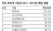 국내에 진출한 주요 외국계 기업들이 최근 3년간 국내에서 벌어들인 순이익의 80%를 배당한 것으로 나타났다. 반면 같은 기간 고용과 투자는 최대 40%가까이 줄여 '한국 경제 단물 빼먹기' 논란이 일고 있다. 27일 기업경영성과 평가업체 CEO스코어가 2013년 기준 매출 1조 원 이상 외국계 투자기업 28곳의 2011~2013년 실적 및 고용, 투자, 배당성향을 조사한 결과 이같이 조사됐다. 외국계 기업 주주들은 대부분 외국인이다. 이 기간 이들 기업의 실적을 들여다보면 총 매출 302조5000억 원, 순이익 12조6000억 원(이익률 4.2%)을 달성했다. 이 가운데 배당으로 나간 돈은 10조890억원이었다. 80.3%의 높은 누적 배당성향을 기록한 것이다. 특히 지난해에는 순이익보다 1조 원 이상 많은 배당을 실시해 131%의 배당성향을 보였다. 국내 10대 그룹의 2013년도 배당성향(26.7%)보다 5배 가까이 높은 것이다. 이 기간 누적 순이익 대비 배당금 비율이 가장 높았던 곳은 한국GM으로 274.5%나 됐다. 한국GM은 2012년 1000억 원 규모의 적자를 내 누적 순이익이 1200억 원에 그쳤지만 배당액은 2000억 원에 이르렀다. 2위는 소니코리아로 지난해 순이익의 1255%에 이르는 배당을 실시해 3년 누적 배당성향이 272.7%에 육박했다. 삼성에서 분리된 코닝정밀소재는 순이익 4조4500억 원의 152.5%인 6조8000억 원을 배당해 3위를 차지했다. 이어 한국바스프(90.9%), 한국델파이(89.2%), 노벨리스코리아(86.1%), 한국IBM(80.4%) 등도 80% 이상의 높은 배당성향을 보였다. 다만 홈플러스, 코스트코코리아, 홈플러스테스코, 아우디폭스바겐코리아, BMW코리아, 노무라금융투자 등은 조사 기간 중 배당을 실시하지 않은 것으로 나타났다. 이들 외국계 기업은 높은 배당성향과 달리 국내 고용과 투자는 크게 줄여나가는 모습을 보였다. 최근 3년 간 이들 기업의 직원 수는 2011년 8만7018명에서 2013년 8만3645명으로 줄었다. 평균 3.9% 감소한 것이다. 같은 기간 국내 10대 그룹은 84만9019명에서 91만221명으로 직원 수를 36.9% 늘려 큰 대조를 이뤘다. 외국계 기업들의 국내 설비투자 금액은 급감하고 있다. 이들 기업의 투자액은 2011년 3조6200억 원이었지만 2013년에는 2조2600억 원으로 줄어 3년 간 37.6%나 감소했다. 박주근 CEO스코어 대표는 "외국계 기업들에 대해 꾸준히 제기되는 '단물 빼먹기', '국부 유출론'이 이유가 있음을 보여주는 대목"이라고 지적했다.임우선 기자 imsun@donga.com}