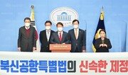 권영진 대구시장과 이철우 경북도지사는 23일 국회 소통관에서 대구경북 통합신공항 특별법 제정을 촉구하는 성명서를 발표했다. 권 시장은 “국회 국토교통위원회가 가덕도신공항 특별법을 통과시킨 반면 대구경북 통합신공항 특별법은 계류시켜 국론 분열을 조장하고 있다. 지역 균형발전을 위해 반드시 대구경북 통합신공항 특별법을 제정해야 한다”고 말했다. 이 도지사는 “대구경북 통합신공항은 군 공항과 민간 공항이 함께 옮기는 최초의 국책 사업이다. 재정을 지원하는 근거를 마련하기 위한 특별법이 반드시 필요하다”고 말했다. 성명 발표는 19일 국회 국토위가 가덕도신공항 특별법만 통과시킨 것에 따른 대응 차원으로 보인다. 당시 국토위는 무소속 홍준표 국회의원(대구 수성을)과 국민의힘 추경호 국회의원(대구 달성군)이 각각 발의한 대구경북 통합신공항 특별법을 법안소위에 계류시켰다. 대구시와 경북도는 통합신공항이 특별법으로 국비 등 정부 지원을 받지 못하면 사업이 쉽지 않을 것으로 보고 있다. 이 때문에 17일 권 시장과 이 도지사가 국회를 찾아 김상희 국회 부의장과 이낙연 더불어민주당 대표, 김종인 국민의힘 비상대책위원장 등을 만나 특별법 제정에 힘을 모아줄 것을 촉구했다. 그러나 이틀 뒤 국회 국토위 문턱을 결국 넘지 못했다. 반면 가덕도신공항 특별법은 본회의까지 쉽게 통과할 것으로 예상된다. 대구시와 경북도, 지역 정치권은 통합신공항 특별법안이 다시 상정될 수 있도록 노력할 방침이다. 국민의힘 김상훈 국회의원(대구 서)은 국토부와 협의해 신공항 연결철도 지원 등의 내용을 담은 법안을 준비하고 있다.명민준 기자 mmj86@donga.com}