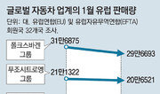 현대자동차그룹이 유럽 완성차 시장에서 지난달 기준으로 포드를 제치고 4위로 올라섰다. 스포츠유틸리티차량(SUV)의 인기에 힘입어 상위 10위권 글로벌 완성차 업체 중 판매량이 유일하게 증가한 것으로 미국에 이어 유럽 시장에서도 반등세를 이어갈지 관심이 쏠린다. 18일 유럽자동차제조협회(ACEA)에 따르면 현대·기아자동차의 지난달 유럽 시장 판매량은 8만2667대로 전년 대비 0.5% 늘어났다. 시장 점유율은 6.7%로 0.3% 증가해 6.4%에 그친 포드를 앞섰다. 현대차그룹 관계자는 “현대차의 코나와 기아차의 니로 등 SUV의 판매량이 크게 늘어나면서 경쟁사의 부진에도 유럽 시장에서 선방할 수 있었다”고 설명했다. 특히 기아차의 경차 모닝과 신형 씨드 등을 통해 전체 판매량을 늘리는 데 성공했다. 유럽 지역에서 포드의 판매량은 7만8485대로 지난해 1월에 비해 6.6% 급감하며 순위도 5위로 밀려났다. 1위 폴크스바겐그룹(―6.5%)과 2위 푸조시트로엥(PSA)그룹(―1.9%) 등의 판매량 감소폭도 컸다. 도요타그룹 등 일본 완성차 업체의 판매량 역시 줄어들었다. 유럽 시장 전체로 보면 지난달 완성차 판매량은 122만6446대로 전년 대비 4.6% 감소했다. 유럽 지역의 완성차 판매량 감소 추세는 지난해 8월부터 5개월째 이어지고 있다. 송선재 하나금융투자 연구원은 “디젤 자동차 등의 배출가스를 규제하는 세계표준자동차시험방식(WLTP) 제도의 유럽 지역 내 시행이 판매량 감소에 영향을 미쳤다”고 설명했다. 현대·기아차 입장에서는 유럽뿐만 아니라 미국 지역에서 전체 시장 위축에도 SUV를 중심으로 반등세로 돌아선 점이 고무적이다. 현대차의 싼타페와 투싼, 기아차의 쏘렌토와 스포티지 등 SUV가 미국 시장에서 강세를 보였다. 이에 현대·기아차의 지난달 미국 지역 판매량은 7만9396대로 전년 대비 3.3% 증가했다. 다만 미국 시장에서는 고율의 자동차 관세 부과 여부가 현대·기아차의 최대 변수가 될 것으로 전망된다. 한국무역협회는 미국 정부가 한국 완성차 업체에 최대 25%의 관세를 부과하면 대미 수출량이 연간 약 16만 대 감소할 것으로 전망했다. 지민구 기자 warum@donga.com}