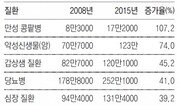 지난해 말 어머니(56)에게 건강검진을 시켜준 한모 씨(31)는 어머니의 소변에 단백질이 섞여 나왔다는 말에 재검진을 요청했다. 결과는 만성 신부전(콩팥병)이었다. 식이요법에 실패하면 평생 혈액투석을 받거나 신장 이식 수술을 해야 한다는 말에 한 씨는 눈앞이 캄캄해졌다. 만성 콩팥병은 소변을 만들어내는 콩팥이 제 기능을 하지 못한 탓에 몸속에 노폐물이 쌓이는 질환이다. 신장에 붙어 있는 혈관 꽈리인 사구체의 여과율에 따라 1∼5기로 나뉜다. 신장 기능이 정상의 10% 이하로 떨어진 5기(말기) 환자는 콩팥을 이식받거나 투석 치료를 하지 않으면 생명을 유지하기 어렵다. 콩팥은 혈압과 골밀도를 유지하는 역할도 하기 때문에 만성콩팥병 환자의 71.3%는 고혈압을 함께 앓고 있고 골절 위험도 높다. 콩팥병은 조기 진단이 필수다. 혈액투석을 받을 정도로 콩팥병이 심해지면 신체적 정신적 질환의 위험이 높아지고 진료비 부담이 늘기 때문이다. 손현순 차의과대 약학대학 교수팀이 2002∼2013년 만성 콩팥병으로 혈액투석을 받은 환자를 분석해보니 1명당 연간 진료비는 2002년 1440만 원에서 2013년 2573만 원으로 크게 증가했다. 혈액투석 환자의 40.2%가 우울 증상을 경험했다는 연구도 있다. 건강검진에서 초기 증세가 포착됐다면 음식에 들어 있는 단백질과 나트륨을 제한해야 한다. 고단백 식단은 요독 증상을 악화시키기 때문이다. 소금을 하루 5g 이하로 섭취하고, 김치나 젓갈 등은 피하는 대신 향이 있는 채소나 후추, 마늘 등으로 맛을 내는 게 좋다. 김순배 서울아산병원 신장내과 교수는 “콩팥병 환자에게는 채소와 과일에 많이 들어 있는 칼륨도 심장마비 위험을 증가시키기 때문에 권하지 않는다”고 말했다. 만성 콩팥병 환자는 고령자의 증가와 함께 급격히 늘고 있다. 2008년 8만3000명이던 만성 콩팥병 환자는 7년 만인 2015년 배가 넘는 17만2000명으로 증가해 모든 만성질환 중 환자 증가세가 가장 가팔랐다. 진료비는 2015년 기준 1조5671억 원으로, 전체 질환 중 고혈압에 이어 두 번째로 많았다. 이는 전체 건강보험 진료비의 3%에 해당한다. 하지만 만성 콩팥병으로 진료를 받는 환자는 전체 환자 중 극히 일부에 불과하다. 표본 조사에 따르면 성인 9명 중 1명은 만성 콩팥병을 앓고 있을 것으로 추정되는데, 이를 2014년 인구에 대입하면 427만 명이다. 하지만 그해에 만성 콩팥병으로 진료받은 환자는 15만8000명(3.7%)에 불과했다. 의료계에선 만성 콩팥병을 미리 잡아낼 수 있도록 당뇨병 환자나 고령자 등 취약군을 대상으로 정기적인 만성 콩팥병 검사를 해야 한다는 주장이 나온다. 질환이 말기에 이르는 것을 예방해야 환자와 가족들의 부담도 줄어든다는 취지다. 김성남 대한신장학회 보험법제이사는 “국내 혈액투석 환자의 약 22%는 의료급여 수급자인데, 이들에게 적용되는 수가는 14만6120원으로 원가(15만6000원)에도 못 미친다”고 지적했다. 조건희 기자 becom@donga.com}