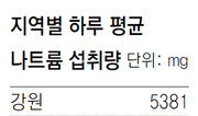 강원 주민들이 전국에서 가장 짜게, 반면 호남 주민들은 가장 싱겁게 먹는다는 연구 결과가 나왔다. 평균 기온이 높은 남도 지역의 음식이 짜다는 통념을 뒤엎는 결론이다. 국민대 식품영양학과 정상진 교수팀은 2010∼2012년 국민건강영양조사에 참여한 8세 이상 2만387명의 영양소 섭취량을 분석한 결과 강원 주민들의 하루 평균 나트륨 섭취량이 5381mg으로 전국 평균(4867mg)보다 10.6% 많았다고 24일 밝혔다. 이는 세계보건기구(WHO) 권장량(2000mg)의 2.7배에 해당한다. 충청(5011mg), 서울·경기·인천(4895mg), 영남(4798mg) 지역의 하루 평균 나트륨 섭취량이 그 다음으로 많았고, 장류와 젓갈로 유명한 호남 지역은 4606mg으로 가장 적었다. 연구팀은 강원과 충청 지역 주민의 나트륨 섭취량이 많은 이유로 김치를 언급했다. 한국보건산업진흥원과 가톨릭대 등의 과거 연구 결과에 따르면 해당 지역 주민들은 다른 지역보다 김치를 더 많이 먹는다. 소금에 절여 만드는 김치는 자주 먹으면 나트륨 섭취량에 큰 영향을 미친다. 흔히 ‘소금 덩어리’로 인식되는 장류와 젓갈은 먹는 빈도가 낮아 전체 나트륨 섭취량의 5%에도 미치지 않았다. 농촌 지역 노인들이 저염식에 상대적으로 덜 민감한 점도 원인으로 꼽힌다. 질병관리본부에 따르면 가공식품을 고를 때 영양표시를 읽는 65세 이상 고령자는 남성 5.5%, 여성 4.9%로 전체 연령 평균(남성 18.3%, 여성 34.9%)보다 훨씬 낮은데, 강원 지역의 노인인구 비율은 2015년 기준 16.9%로 높다. 정상진 교수는 “지역마다 나트륨 섭취량이 다르기 때문에 적정 수준으로 줄이기 위해선 맞춤형 교육과 홍보가 필요하다”고 말했다. 조건희 기자 becom@donga.com}