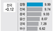 4년 전 18대 총선과 이번 19대 총선에서 새누리당이 차지한 의석수는 각각 153석, 152석으로 거의 변동이 없다. 차이는 지역별 의석분포에서 확연히 나타난다. 수도권의 경우 81석에서 43석으로 반 토막이 난 반면 4년 전 고전했던 충청과 강원에서는 크게 약진했다. 이 같은 총선 결과를 집값 변동과 관련짓는 분석이 부동산 업계에서 나온다. 새누리당이 압승을 거둔 부산, 충청, 강원은 지난해부터 집값이 크게 뛰었고, 주택경기 침체가 지속되는 수도권에서는 민주통합당이 눈에 띄는 약진을 보였기 때문이다. 13일 부동산정보업체 부동산114에 따르면 전국 16개 시도의 최근 1년간 아파트 매매가는 강원(9.99%) 전북(9.74%) 충북(9.03%) 울산(8.07%) 경북(7.28%) 부산(6.62%) 대전(6.61%) 등의 순으로 높은 상승률을 나타냈다. 집값이 가장 많이 오른 강원도는 이번 총선에서 9석 모두 새누리당이 차지했다. 18대 총선에서 옛 한나라당(3석), 통합민주당(2석), 무소속(3석)이 고른 분포를 보였던 데다 도지사와 교육감 선거 등 최근 투표에서 잇달아 야당의 손을 들어준 것과는 딴판이다. 대전·충청권에서도 새누리당은 25석 중 12석을 차지해 의외의 약진을 거뒀다. 두 지역은 평창 겨울올림픽 유치, 세종시 등의 개발호재로 부동산 시장이 활성화됐다는 공통점이 있다. 반면 뉴타운 사업의 무산과 각종 아파트 관련 규제, 경기 부진 등으로 아파트값이 고전을 면치 못한 수도권에선 결과가 달랐다. 최근 1년간 인천(―3.39%) 서울(―3.26%) 경기(―1.48%) 등 수도권 일대 집값은 하락세를 보였다. 민주통합당은 이번 총선에서 서울에서 30석(2008년 8석)을 확보하는 등 수도권에서만 65석을 가져갔다. 다만, 전통적으로 보수 성향이 강한 강남 서초 용산 송파 양천구 등 서울의 아파트값 상위 5개 지역은 아파트값 약세에도 불구하고 모두 새누리당이 승리했다. 집값과 선거 결과에 확실한 인과관계가 있다고 보기는 힘들지만 그동안 한국 정치에서는 이 같은 ‘상관관계’가 꽤 잘 들어맞았다. 2009년 동아일보가 2000∼2008년에 치러진 7차례의 선거와 아파트값의 상관관계를 분석한 결과에서도 아파트값이 상대적으로 많이 오른 지역에서 옛 한나라당의 득표율도 상승한 것으로 나타났고, 수도권에서 이 같은 경향이 뚜렷했다. 김은진 부동산114 연구원은 “집값 상승에 따른 자산소득 증가가 정당 선호도에 일정 부분 영향을 끼친 것으로 해석된다”고 말했다.박선희 기자 teller@donga.com}