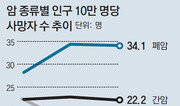 김모 씨(64·경기 하남시)는 2011년 퇴직을 앞두고 건강검진에서 위암 초기 진단을 받았다. 다행히 암 크기가 작아 복강경 수술을 받았다. 수술 후 5년간 암이 재발하지 않아 올해 2월 완치 판정을 받은 김 씨는 집 근처 복지관에서 봉사활동을 하며 새 인생을 살고 있다. 김병식 서울아산병원 위장관외과 교수는 “위암은 초기 증상이 뚜렷하지 않아 병을 키우는 일이 많지만 조기에 발견하면 생존율을 높일 수 있다”고 말했다. 암을 조기에 발견해 치료받는 환자가 늘면서 지난해 암 사망률(인구 10만 명당 사망자 수)이 4년 만에 처음으로 감소했다. 통계청에 따르면 2011년 142.8명 이후 2014년(150.9명)까지 줄곧 상승한 암 사망률이 지난해 150.8명으로 소폭 줄었다. 암 사망률은 1998년 이후 2011년 한 해를 제외하곤 상승세를 멈춘 적이 없다. 이는 위암 사망률이 대폭 줄어든 데 따른 것이다. 위암 사망률은 2005년 22.5명에서 2014년 17.6명으로 줄었고, 지난해에도 16.7명으로 전년 대비 4.7% 줄었다. 전문가들은 덜 짜고 덜 맵게 먹는 순한 식단을 ‘1등 공신’으로 꼽는다. 자극적인 음식을 오래 먹으면 위 점막이 위축되는 등 위에 손상을 주고 또 위산이 줄면서 위암을 일으키는 헬리코박터와 같은 세균이 잘 번식하기 때문이다. 식품의약품안전처에 따르면 한국인의 1일 평균 나트륨 섭취량은 2010년 4878mg에서 2014년 3890mg으로 줄었다. 냉장고 보급으로 소금을 덜 먹고 과일을 더 먹어 위암 사망률이 줄었다는 서울대 의대의 연구 결과도 있다. 또 다른 원인은 암 조기 발견 환자가 증가한 것. 국립암센터에 따르면 정부와 건강보험공단이 제공하는 국가 검진과 개인 검진을 합한 암 검진 수검률은 2011년 56.1%에서 지난해 65.8%로 높아졌다. 위암 수검률은 2002년 40%에서 지난해 74.8%로 크게 상승했다. 반면 대표적인 여성암인 유방암, 자궁암 사망률은 전년보다 각각 0.1명씩 높아졌다. 이는 야근과 장시간 노동 등 여성의 근로 조건이 악화되고 빠른 초경과 늦은 출산 등으로 인해 암 위험성이 높아졌기 때문이라는 분석이 많다. 유방, 자궁암은 국가 검진 대상이지만 수검률이 각각 61.2%, 65.6%로 미국 영국 등 선진국보다 10%포인트 이상 낮다. 특히 폐암 사망률은 34.1명으로 전년보다 0.3명 줄었지만 여전히 암 중에 가장 높다. 2위(간암 22.2명)와의 격차도 크다. 조기 진단이 어렵고 예후가 나쁘기 때문이다. 다만 전문가들은 내년부터 폐암 고위험군에게 검진비가 지원되는 점, 수술 후 5년간 생존한 환자 비율이 2001∼2006년 58.5%에서 2007∼2011년 65.3%로 증가한 점 등을 긍정적으로 평가하고 있다. 김열 국립암센터 암관리사업부장은 “암세포를 초기에 찾아내 없애는 정밀치료 기술과 맞춤형 치료 등이 발달하면 사망률이 더 낮아질 것”이라고 말했다. 조건희 becom@donga.com·임현석 기자}