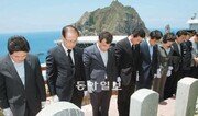새누리당 황우여 대표 등 지도부가 28일 독도를 방문해 독도경비 근무 중 순직한 대원 6명의 위령비 앞에서 묵념하고 있다. 왼쪽부터 유기준 최고위원, 황 대표, 이정현 최고위원, 황영철 대표 비서실장, 김영우 대변인, 이인선 경북도 정무부지사. 독도=국회사진기자단}