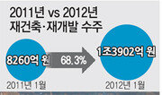 서울시의 뉴타운 출구정책 등으로 재개발·재건축 시장이 꽁꽁 얼어붙고 있는 가운데 건설사들이 1월에 재개발·재건축으로 1조 원 넘게 수주한 것으로 드러나 눈길을 끌고 있다. 13일 한국건설산업연구원에 따르면 올해 1월 재개발·재건축 수주액은 1조3902억 원으로 지난해 1월보다 68.3%가 늘었다. 1월 재개발·재건축 수주액이 1조 원을 돌파한 것은 2003년(1조3380억 원) 이후 9년 만이다. 재개발은 서울을 비롯한 수도권을 중심으로 전년 동월보다 47.1% 증가한 9281억 원을 수주했다. 재건축은 경기와 대구, 경남 등지의 호조로 작년 1월보다 136.6% 늘어난 4621억 원에 달했다. 최근 부동산 경기침체와 서울시 정책 등으로 대형 재개발·재건축 사업이 위축되는 상황에서 이처럼 건설사 수주가 증가세를 보이는 것은 이례적인 일로 평가된다. 서울시는 올해 1월 주민 반대가 심한 초기 사업 단계의 뉴타운 등을 정비구역에서 해제할 수 있다는 내용의 ‘뉴타운·정비사업 신(新)정책구상’을 발표하고, 2월에는 재건축 아파트의 소형주택 의무 비율을 상향하겠다는 방침을 밝혔다. 하지만 이번 수주 증가를 주택경기 회복을 보여주는 지표로 보기는 어렵다는 것이 전문가들의 해석이다. 건산연의 한 관계자는 “건설사들이 서울시 정책에 따라 향후 재개발·재건축 사업이 위축될 것으로 예상해 정책 변경 직전에 앞다퉈 수주에 나섰을 가능성이 있다”며 “주택경기 회복의 신호탄이라기보다는 정책 리스크를 피하기 위한 일시적인 쏠림 현상일 가능성이 크다”고 말했다. 박선희 기자 teller@donga.com}