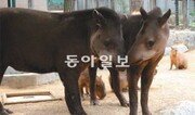 5월 4일 아메리카테이퍼 암컷 ‘흑두부’와 수컷 ‘검은콩’의 첫날밤. 첫눈에 반한 둘은 원을 그리며 빙빙 돌고 ‘킥킥’ 소리를 내며 냄새를 맡았다. 국내에 단 한 마리뿐이던 희귀동물 아메리카테이퍼 흑두부가 9세 연하의 검은콩을 맞이한 첫날밤은 뜨거웠다. 3일 서울동물원에 따르면 13세 난 흑두부와 4세 검은콩이 신방을 차려 아메리카테이퍼 2세 탄생의 기대감이 높아지고 있다. 검은콩은 일본 나고야 동물원으로부터 4월 데릴사위로 데려왔다. 한 달 적응 기간을 거친 뒤 흑두부와 합방에 성공한 것. 테이퍼의 수명이 25세 정도인 점을 감안할 때 흑두부는 생의 절반 이상을 짝 없이 지냈다. 서울동물원은 짝을 지어주기 위해 노력했지만 국내선 찾을 수 없어 애를 태웠다. 동물원은 두부처럼 연한 피부를 강조해 흑두부란 이름을 붙였고, 수컷은 작고 단단한 체형이라서 검은콩이라 부른다. 몸은 곰, 코는 코끼리, 눈은 코뿔소를 닮은 아메리카테이퍼는 남아메리카 아마존 강 유역이나 우림에 서식하는 포유류다. 고대 신화에 등장하는데 꿈을 먹고사는 동물로도 알려져 있다. 국제야생동식물 멸종위기종거래에 관한 조약(CITES)으로 보호받는 희귀동물이다.우경임 기자 woohaha@donga.com}