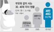 다섯 살 난 아들을 키우기 위해 시댁에서 살고 있는 직장인 오모 씨(34). 요즘 오 씨가 “시부모님과 산다”고 하면 모두 “부럽다”는 반응을 보인다. 아이 돌보미를 잘못 구해 속을 썩이거나 퇴근길 어린이집으로 뛰어가는 일이 없기 때문이다. 오 씨는 “시집살이는 옛말이다. 오히려 부모들이 ‘자녀살이’를 하고 싶지 않다고 하는데 나는 운이 좋은 편”이라고 말했다. 자녀가 부모를 ‘봉양하는’ 게 아니라 부모가 자녀를 ‘모시고’ 산다는 사실이 통계로도 입증됐다. 1일 서울시가 발표한 ‘통계로 보는 서울 가족’에 따르면 서울에서 부모와 동거하는 30, 40대 자녀가 10년간 91%나 증가했다. 부모와 동거하는 30, 40대 성인은 2010년 48만4663명으로 2000년(25만3244명)에 비해 91% 증가했다. 30∼49세 서울 주민 중 14.7%에 해당한다. 부모와 동거하는 이유에는 한국 사회의 30, 40대가 짊어진 고통이 그대로 드러난다. 60세 이상 부모가 자녀와 동거하는 이유 1위는 ‘자녀가 경제적 이유 등으로 독립생활이 불가능해서’(29%)였다. ‘손자손녀 양육이나 자녀의 가사를 돕기 위해서’(10.5%)까지 합하면 자녀 부양 때문에 함께 산다는 응답이 39.5%에 달했다. 부모가 ‘경제력이나 건강의 이유로 독립생활이 불가능해서’(32.3%)라는 응답보다 높다. 부모 부양이 자녀의 몫이라는 가치관도 크게 달라졌다. 15세 이상 서울시민 중 ‘자녀가 부모를 부양해야 한다’에 동의하는 비율은 2006년 60.7%에서 2010년 30.4%로 4년간 절반으로 줄었다. 실제 60세 이상 노인도 자녀와 함께 살고 싶어 하지 않았다. ‘자녀와 함께 살고 싶다’는 응답 비율은 2005년 49.3%로, ‘살고 싶지 않다’(50.7%)와 비슷한 수준이었다. 그러나 2011년에는 ‘함께 살고 싶다’는 응답이 29.2%로 ‘같이 살고 싶지 않다’(70.3%)의 절반에도 못 미쳤다. 이명진 고려대 사회학과 교수는 “실업이나 양육 같은 현실적인 문제를 개인이 해결하려다 보니 부모와 같이 사는 성인이 늘게 된 것”이라며 “개인의 부담을 국가가 덜어주려는 정책적인 배려가 필요하다”고 말했다.우경임 기자 woohaha@donga.com}