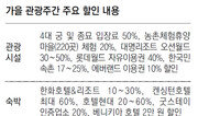 문화체육관광부는 가을 관광주간(10월 19일∼11월 1일)을 맞아 전국 관광 관련 업체 3500여 곳이 일제히 세일에 들어간다고 1일 밝혔다. 관광주간은 봄·가을 비수기에 약 2주 동안 전국적인 ‘관광세일’을 실시해 연중 상시 휴가 문화를 정착하고 내수를 활성화하기 위해 지난해 봄에 처음 도입됐다. 이 기간에 광역지자체별로 17개의 관광주간 대표 프로그램을 운영한다. 대구와 대전은 지역의 대표 관광지와 연계해 고유의 음식문화를 느낄 수 있는 미식여행 프로그램을 마련했다. 강원과 전북 지역에서는 가을에 둘러보면 좋은 명소들을 엮어 가을 여행을 할 수 있도록 ‘열차 타고 떠나는 강원도 가을 낭만여행’과 ‘전북의 아름다운 길 따라 달팽이 여행’을 각각 운영한다. 전국의 관광시설과 숙박, 교통시설도 할인에 들어간다. 4대궁과 종묘 입장료를 50% 할인해 주고, 대명리조트의 오션월드는 30∼50%, 롯데월드 자유이용권은 40% 할인 판매한다. 한화호텔&리조트는 10∼30%, 켄싱턴호텔은 최대 60%까지 숙박요금을 깎아준다. 단체 승객이 한국철도공사의 관광열차를 주중에 이용할 경우 10∼30% 요금 할인을 받을 수 있으며, 아시아나항공은 제주노선 티켓에 한해 최대 70% 할인 판매한다.최고야 기자 best@donga.com}