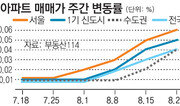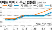 최경환 경제부총리 겸 기획재정부 장관이 이끄는 ‘2기 경제팀’의 경제 살리기 대책이 발표된 지 한 달째에 접어들면서 부동산 시장 상승에 속도가 붙는 모양새다. 24일 부동산114에 따르면 지난주 아파트 매매시장은 △서울 0.06% △1·2기 신도시 0.05% △경기·인천 0.04% 상승했다. 서울은 서초구, 중구, 강남구, 강동구, 관악구 등지에서 0.1%를 웃도는 가파른 상승세를 보이며 오름폭을 키웠다. 특히 대출 규제 완화 이후 재건축 급매물이 빠르게 팔려나가고 있는 서초구의 경우 한신2차, 한신6차, 우성 등 대부분의 재건축 단지가 500만∼3500만 원 올랐다. 전세시장은 가을 이사철을 앞두고 꾸준히 오르고 있다. △서울 0.06% △1·2기 신도시 0.05% △경기·인천 0.05%의 상승률을 나타냈다. 서울은 강동구, 서대문구, 동작구, 중구, 도봉구 순으로 전세금이 많이 올랐다. 다만 입주 물량이 쏟아지는 동대문구, 마포구 등은 하락했다.홍수영 기자 gaea@donga.com}