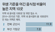 《 폭염이 이어지면서 학교 급식뿐만 아니라 음식점 내 식중독에 대한 우려도 함께 높아지고 있다. 전체 식중독 환자 중 음식점에서 균에 감염된 비율은 2012년엔 18.8%였지만 올해(7월 기준)는 40.1%로 학교 급식에서 감염된 환자를 앞질렀다. 동아일보가 최근 2년간 식품위생법 위반으로 적발된 음식점 3848곳의 전체 명단을 입수해 지리정보시스템(GIS)으로 분석해보니 ‘위생 불량 음식점’의 밀집도가 지역마다 최대 60배 가까이 차이가 났다. 주요 관광지 음식점에서도 족발에 파리 알이 섞여 들어가거나 샐러드에서 대장균이 검출되는 등의 사례가 끊이지 않았다. 》 18일 제주 서귀포시 안덕면의 C생선요리점에서 점심을 먹은 회사원 최모 씨(41)와 최 씨의 가족 2명은 저녁에 심한 복통으로 응급실을 찾았다. 이미 응급실엔 같은 음식점에서 회를 먹었던 다른 일행 4명이 누워 있었다. 이들은 전부 식중독 진단을 받았다. 최 씨는 “식당을 잘못 골라 가족 여행을 망쳐버렸다”며 울상을 지었다.○ 군산 음식점 100곳 중 1곳이 위생 기준 위반 동아일보 취재팀이 전국 음식점(일반음식점, 휴게음식점, 제과점) 74만9839곳 중 2014∼2015년 식품위생법 위반으로 식품의약품안전처와 지방자치단체로부터 행정처분을 받은 3848곳의 명단을 입수해 분석해 보니 음식과 조리시설, 종업원의 위생이 불량한 ‘위생 기준’ 위반 사례가 1274건이었다. 유형별로는 감염병 검사를 받지 않은 종업원을 고용하거나 위생 교육을 실시하지 않고, 위생모를 착용하지 않은 사례가 613건(48.1%)으로 가장 많았다. 음식에 파리 알이나 담배꽁초가 섞여 있거나 식수, 얼음 등에서 대장균이 기준치보다 많이 검출된 사례는 457건(35.9%)이었고, 조리기구를 세척하지 않거나 주방에서 뚜껑도 없는 쓰레기통을 쓰는 등 비위생적인 시설물 관리는 204건(16%)이었다. 이러한 ‘위생 불량 음식점’의 밀집도는 시군구별로 크게 차이가 났다. 전국 시군구 252곳 중 음식점 1000곳당 위반 업소가 가장 많은 지역은 전북 군산시(11.9곳)로, 위반 업소가 가장 적었던 경북 경주시(0.2곳)의 60배에 가까웠다. 부산 기장군(7곳), 인천 연수구(7곳)가 뒤를 이었다. 서울에선 관악구(3.9곳) 양천구(3.1곳) 강동구(2.7곳)가 가장 많았고, 음식점이 몰려 있는 중구(0.2곳)와 종로구(0.6곳)는 오히려 상대적으로 적었다. 유명 관광지도 안전지대는 아니었다. 전주한옥마을이 있는 전북 전주시 완산구와 제주 서귀포시의 음식점 1000곳당 위반 업소 수도 각각 6.3곳, 5.9곳으로 전국 평균(1.7곳)을 훨씬 웃돌았다. ‘비즈지아이에스’의 지리정보시스템(GIS)으로 위생 불량 음식점의 정확한 위치를 확인해 보니 부산 해운대해수욕장 인근엔 우동에서 대장균이 나오거나 유통기한이 지난 치킨 소스를 사용하는 등 위반 업소가 6곳이나 몰려 있었다. 대전 유성온천 주변에도 냉동 감자를 상온에 보관한 키즈카페나 김밥에서 머리카락이 나온 분식점 등 5곳이 밀집해 있었다. 이 중 일부 지역은 관할 지방자치단체가 적극적으로 단속에 나섰기 때문에 적발 비율도 덩달아 높게 나타났다는 분석도 있지만, 대다수는 음식점을 상대로 식중독 예방 교육과 안전 점검을 소홀히 한 결과라는 지적이 많다. 정기적으로 업주와 종업원을 상대로 교육을 실시하고 습관적으로 위생 기준을 어기는 곳에 강한 제재를 가해야 위반 업소를 줄일 수 있는데, 일정 기간마다 ‘실적 쌓기’ 식으로 단발성 단속을 벌이는 방식이 대부분이기 때문이다. 위생 불량 음식점 비율이 높았던 전북 군산시는 음식점 지도점검률이 0.1%도 되지 않았다.○ 학교 급식 앞지른 음식점 식중독 기록적인 폭염 속에 중고교 급식에서 집단 식중독이 잇따르고 있다. 식약처는 19∼22일 전국 중고교 9곳에 이어 24일 서울 동대문구 D고등학교에서도 식중독 환자 42명이 집단 발생했다고 밝혔다. 하지만 음식점 내 식중독은 학교 급식보다도 심각하다. 올해(7월 기준) 식중독 환자 2818명 중 음식점에서 식중독에 걸린 환자는 1129명(40.1%)으로 학교 급식에 따른 환자(880명)보다 많았다. 2014년엔 음식점 식중독 환자의 비율이 23.6%로 학교 급식 환자(55.4%)의 절반도 되지 않았지만 지난해 25.8%에 이어 올해 급증한 것이다. 음식점 식중독 환자가 학교 급식보다 많았던 것은 2007년 이후 처음이다. 문제는 음식점에서 식사를 한 뒤 병·의원이나 보건소에서 식중독으로 확진되더라도 해당 음식점을 적발하기가 쉽지 않다는 점이다. 현행 식중독 검사 기준에 따르면, 식중독 환자가 발생하면 환자가 실제로 섭취했던 음식물을 수거해 식중독균 포함 여부를 입증해야 한다. 단체 급식소에선 제공한 음식물 중 일정 부분을 반드시 의무적으로 표본으로 보관해야 하기 때문에 사후에 인과관계를 입증하기 쉽지만 음식점엔 이런 의무 조항이 적용되지 않는다. 이 때문에 2014년 당국이 조사를 벌이고도 원인균을 찾아내지 못한 식중독 조사 사례는 12.3%에 이른다.조건희 becom@donga.com·김호경 기자}