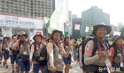 기록적인 폭염을 뚫고 2주간의 국토대장정을 마친 대학생 72명이 7일 서울광장에 도착했다. “파이팅” 구호를 외치며 걸어오던 학생들은 결승선을 통과하는 순간 들고 있던 생수를 뿌리며 환호했다. 삼삼오오 모여 얼싸안고 함께 울며 기쁨을 나누기도 했다. 이날 오후 4시 서울광장에서는 ‘2018 제15회 노스페이스 대한민국 희망원정대’의 국토대장정 완주식이 열렸다. 2004년 시작된 희망원정대는 국내외 대학생들이 직접 국토를 걸으면서 애국심과 협동심, 도전정신을 키우는 것을 목적으로 한다. 박영석탐험문화재단이 주관하고 서울시가 후원한다. 세계 7대륙 최고봉과 3극점(남극점 북극점 에베레스트) 원정에 성공했던 산악인 고 박영석 씨의 정신을 이어받자는 취지다. 올해는 남녀 36명씩 총 72명의 대학생이 지난달 23일부터 이날까지 15박 16일간의 일정을 소화했다. 전북 변산반도에서 시작해 군산, 충남 보령과 예산, 경기 화성과 군포 등을 거쳐 서울광장에 도착하기까지 총 350km를 걸었다. 박영석탐험문화재단 관계자는 “기록적인 무더위가 이어지며 학생 2, 3명이 쓰러지기도 해 조마조마했다”며 “그러나 결국 한 명의 낙오자도 없이 모두 무사히 서울광장에 들어왔다”고 설명했다. 국토대장정이 인생의 버킷리스트였다는 대학생 고혜수 씨(22·여)는 “타는 듯한 햇빛에 알레르기가 생겨 수포가 터질 때 포기하고 싶었지만 동료들과 서로 의지하며 여기까지 올 수 있었다”며 “목표에 대한 의지가 삶에서 얼마나 중요한지 배우는 계기가 됐다”며 눈물을 닦았다. 서울시 윤준병 행정1부시장은 “‘단 1%의 가능성만 있어도 절대로 포기하지 않는다’는 고 박영석 산악인의 철학이 여러분의 인생 여정의 버팀목이 되기 바란다”고 말했다. 희망원정대는 행진 1km당 1만 원씩, 총 350만 원을 적립해 사회복지법인 한국심장재단에 청소년 소외계층 성금으로 전달하게 됐다. 행사를 주최한 영원아웃도어는 매칭그랜트 방식으로 희망원정대가 적립한 금액과 같은 액수를 더해 함께 기부한다. 김예윤 기자 yeah@donga.com}