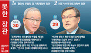 박근혜 정부에서 ‘일을 가장 못한 장관’으로 꼽힌 현오석 부총리 겸 기획재정부 장관, 최문기 미래창조과학부 장관, 윤진숙 해양수산부 장관, 방하남 고용노동부 장관, 황교안 법무부 장관의 공통점은 ‘리더십과 돌파력의 부족’으로 요약된다. 국정 운영에 ‘드라이브’를 걸어야 할 정권 첫해에 추진력이 부족한 장관들을 기용해 정부 스스로 실적을 올릴 기회를 잃었다는 지적이 나온다.○ 조정 능력 부족으로 위기 자초 이 중 경제 장관들은 대체로 학자 출신이거나 현 부총리처럼 공무원 출신이라도 오랜 기간 연구소에 몸담은 이력을 갖고 있다. 현 부총리는 재임 기간 중 부처 간 조정 능력에서 한계를 드러낸 사례가 많았다. 대표적인 것이 지난해 7월 부동산 경기를 살릴 주요 정책인 취득세 인하 문제를 놓고 부처 간 갈등의 골이 깊어졌을 때였다. 당시 취득세 인하로 줄어들 지방세수를 놓고 안전행정부와 국토교통부가 갈등을 빚는 동안 현 부총리는 이를 적절히 조정하지 못했다는 평가를 받았다. 박근혜 대통령이 국무회의에서 “국민이 혼란스러울 것이다, 부총리가 컨트롤타워 역할을 하라”고 질책하고서야 움직였다. 경제민주화 입법이 과도하다는 지적이 작년 상반기 내내 이어졌지만 지난해 6월 17일 청와대 수석비서관회의에서 대통령이 이 문제를 지적하자 그제야 과도한 입법에 반대하는 목소리를 냈다. ○ 부하 직원들조차 불신 “장관이 답변하는데 의자를 뒤로 젖히고 듣는 태도는 뭡니까.” 지난해 10월 15일 정부세종청사에서 열린 해양수산부 국정감사장에서는 난데없이 ‘경청 태도’에 대한 질타가 나왔다. 최규성 국회 농림수산식품위원회 위원장은 배석한 해수부 공무원들을 질타한 뒤 윤진숙 해양수산부 장관에게 “제발 공무원들에게 휘둘리지 마세요”라고 충고했다. 윤 장관은 이처럼 지난해 4월 임명된 뒤 끊임없이 “조직 장악력이 부족하다”는 비판을 받아 왔다. 이명박 정부 때 폐지됐다가 박근혜 정부 출범과 함께 부활한 해수부가 아직 이렇다 할 정책을 내놓지 못하는 것도 조직이 하나로 뭉쳐 일사불란하게 움직이지 못했기 때문이라는 분석이 있다. 9월 북극항로를 통해 화물을 운송한 ‘북극항로 개척’을 최대 성과로 내세우지만 이마저 현대글로비스 한 곳만 참여해 모양새를 구겼다. 치열한 유치 경쟁을 벌였던 북태평양수산위원회(NPFC) 사무국은 결국 9월 일본이 차지했다. 미래부 최문기 장관의 단점은 ‘존재감’이 약하다는 것이다. 박근혜 정부가 의지를 갖고 만든 ‘창조경제의 주무 부처’인데도 강력한 추진력을 보여주는 데 실패했다는 평가가 많다. 이 때문에 출범 1년이 다 되도록 “미래부가 뭐 하는 부처인지 모르겠다”는 국민이 적지 않다. 미래부의 한 공무원은 “부처 특성상 다른 부처의 협조를 이끌어내야 하는 일이 많지만 실질적 권한이 크지 않다 보니 아이디어가 있어도 용두사미로 끝나는 경우가 많다”고 토로했다.○ “나무보다 숲을 보는 장관 필요” 방하남 장관은 정부와 노조 사이에서 청와대의 뜻을 전달하는 데 급급하다는 인상을 남겼다. 노동부처 장의 중요한 역할인 조정 및 중재 능력을 거의 발휘하지 못했다는 평가를 받았다. 지난 연말의 철도노조 파업 때도 마찬가지였다. 파업이 한창 때인 지난해 12월 23일 국회에 출석한 방 장관은 “경찰의 민노총 진입 계획을 사전에 알지 못했다”고 말해 논란이 됐다. 정권교체기마다 반복되는 법무 및 검찰 조직의 혼돈을 황교안 법무부 장관도 피하지 못했다. 대표적 공안통 검사 출신인 황 장관은 국정원 댓글 사건 처리에 외압을 행사했다는 의혹이 제기돼 구설에 올랐다. 지난해 6월 공직선거법 적용 여부를 놓고 검찰 지휘부와 불협화음을 내더니 급기야 지난해 10월에는 당시 조영곤 서울중앙지검장과 윤석열 여주지청장(전 특별수사팀장)이 정면충돌하는 모습을 무기력하게 지켜봐야 했다. 홍성걸 국민대 행정정책학부 교수는 “부분적인 전문성을 바탕으로 보는 ‘좁은 미래’가 아니라 종합적인 시각을 토대로 ‘넓은 미래’를 그릴 줄 아는 장관이 필요하다”고 말했다.세종=홍수용 legman@donga.com임우선·이성호 기자▼ 대북 중심잡고… 책임장관으로 정책 돌파 ▼상위 5명 무엇을 잘했나박근혜 정부 1년간 가장 잘한 장관으로는 김관진 국방부 장관(24표)이 올랐다. 창설 이래 두 명의 대통령을 모신 첫 국방부 수장인 김 장관은 유례없이 강했던 북한의 도발 위협에 맞선 강골무인(强骨武人)으로서 국민에게 신뢰감을 줬다는 평가를 받았다. 2위로는 조윤선 여성가족부 장관(18표), 3위는 유정복 안전행정부 장관(12표) 순이었다. 이들 세 사람은 박 대통령의 강한 신뢰를 받는 ‘실세 장관’이라는 공통점이 있다. 서승환 국토교통부 장관(11표)과 류길재 통일부 장관(10표)이 뒤를 이었다.○ 강력한 메시지로 대북정책 중심 잡아 김병관 장관 후보자의 낙마로 장관에 유임된 김관진 장관이 현 정부 최고의 인사로 꼽힌 것은 북한의 위협이 크게 기여했다. 박근혜 정부가 출범도 하기 전인 지난해 2월 북한이 3차 핵실험을 감행한 뒤 개성공단 출입을 일방적으로 차단하는 등 한반도 