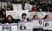 “올해 3·1운동 100주년을 맞이했지만 일본군 위안부 피해 할머니들은 진정한 해방을 맞지 못했다.” 30일 낮 12시 서울 종로구 옛 일본대사관 앞. 일본군 위안부 피해자 문제 해결을 위한 1372번째 정기 수요시위가 열린 이곳에서 메모리아(위안부 문제 해결을 위한 연합동아리) 민은서 회장은 “마지막 순간까지도 ‘싸워야 한다’고 말씀하신 김복동 할머니의 뜻을 이어 일본 정부의 공식 사죄와 그에 따른 배상을 요구한다”며 성명서를 읽어나갔다. 이날 시위는 위안부 피해자의 상징처럼 여겨졌던 김복동 할머니(93)와 또 다른 피해자 이모 할머니(94)가 28일 눈을 감은 뒤 처음 열린 수요 시위다. 두 할머니를 추모하기 위한 시민들의 발걸음이 이어지며 평소보다 많은 300여 명의 시민이 시위에 참여했다. 시위는 두 할머니를 추모하는 마음을 담아 어느 때보다 엄숙하고 진지한 분위기에서 진행됐다. 시위가 시작되기 30분 전부터 초등학생, 아기와 함께 온 젊은 여성, 노인 등 여러 연령대의 시민들이 자리를 채워나갔다. 두 할머니를 추모하는 묵념이 진행되자 곳곳에서 훌쩍이는 소리가 들렸다. 인천에서 온 고교생 이연수 양(17)은 “위안부 피해 할머니들이 한 분이라도 더 살아계실 때 힘을 모아 일본 정부의 사과를 받아내야 한다”고 말했다. 이날 오후 3시경 서울 서대문구 세브란스병원에서는 김 할머니의 입관식이 있었다. 입관식을 지켜본 위안부 피해자 이용수 할머니(91)는 “맘 편하게 하늘나라에 가서 할머니들한테 전해요. 내가 이기고 왔으니 나머지는 용수가 (한다고) 할머니들한테 전해”라며 흐느꼈다. 김 할머니의 빈소 근처에는 ‘내가 기억하는 여성인권운동가 김복동’ 추모벽이 설치됐다. 추모벽에 붙은 1000장가량의 나비 모양 메모지에는 ‘할머니, 수요집회에서 눈 맞추고 웃어주셨던 것 오래 기억할게요’ 등의 글이 담겼다. 강경화 외교부 장관과 문희상 국회의장, 반기문 전 유엔 사무총장 등의 조문도 이어졌다. 구특교 kootg@donga.com·사지원·김소영 기자}