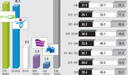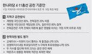 설 연휴 직후(24일) 실시된 동아일보 총선 여론조사에서 민주통합당 후보 지지율이 한나라당 후보 지지율을 오차 범위인 1.0%포인트 격차로 앞서는 것으로 나타났다. 겉으로는 한나라당과 민주당의 지지율이 비슷해 여야의 박빙 승부로 볼 수도 있다. 하지만 30%에 이르는 부동층·무응답층 중에는 야권 성향 유권자가 더 많다고 가정할 때 한나라당이 고전할 수 있는 구도라는 분석이 있다. ○ 40대 표심 이탈 ‘4월 총선에서 어느 정당 후보를 지지하겠느냐’는 질문에 응답자의 27.3%는 민주당을, 26.3%는 한나라당을 꼽았다. 이어 기존 정당이 아닌 무소속 후보 9.0%, 통합진보당 후보 5.0%, 자유선진당 후보 1.9% 순으로 나왔다. 동아일보가 지난해 12월 26, 27일 실시한 여론조사에서는 한나라당 후보 지지가 31.9%, 민주당 후보 지지는 23.2%로 나타났다. 두 조사를 비교하면 한나라당은 한 달 만에 5.6%포인트가 줄었고 민주당은 4.1%포인트 증가한 것이다. 무소속 후보를 지지하겠다는 응답은 한 달 전 13.5%에서 4.5%포인트 낮아졌다. 모름·무응답은 26.3%에서 30.5%로 높아져 향후 이들의 향배에 승패가 결정될 것으로 보인다. 특히 부동층·무응답층은 역대 여론조사와 선거 결과를 비교 분석해볼 때 대체로 야당 성향을 띠었다. 민주당 등 야당 지지로 갈 가능성이 높다는 얘기다. 한나라당은 이들의 표심을 붙들기 위해 쇄신 노력에 더욱 박차를 가할 것으로 보인다. 민주당도 야권 통합 움직임 등에 속도를 낼 것으로 보여 앞으로 여야의 선거운동이 부동층·무응답층의 표심에 어떤 영향을 미칠지 주목된다. 이번 여론조사 결과의 특징 중 하나는 40대의 표심이 민주당으로 기울고 있다는 점이다. 12월 조사에서는 40대의 28.8%가 한나라당을 지지했으나 이번에는 19.0%로 나왔다. 한 달 만에 9.8%포인트가 급격히 줄었든 것으로 40대의 이탈 현상이 현실로 나타난 셈이다. 반면 민주당의 경우는 40대 지지율이 12월 21.2%에서 32.0%로 껑충 뛰었다. 다른 연령층은 기존 추세가 그대로 유지됐다. 20, 30대에서는 민주당이 높았고 50대 이상에선 한나라당의 지지율이 높았다. 한나라당은 대구·경북(41.2%)에서만 민주당(13.7%)에 여유 있게 우세를 유지했을 뿐 부산·울산·경남에선 불과 9.4%포인트 앞서는 것으로 나타났다. 서울에서는 민주당이 한나라당을 2.4%포인트, 인천·경기에서는 한나라당이 민주당을 2.4%포인트 앞섰다, 이처럼 정당 지지율이 비슷하게 나타남에 따라 경쟁력 있는 인물로 승부하기 위한 여야의 후보 영입 경쟁도 치열할 것으로 예상된다.○ “현역 의원 절반 교체해야” 현재 여야가 총선 출마자 결정을 위한 공천심사 준비에 박차를 가하고 있는 가운데 유권자 10명 중 5명은 현역 의원을 물갈이해야 한다는 입장을 나타냈다. ‘지역 국회의원이 다시 출마한다면 지지하겠느냐’는 질문에 ‘지지할 것이다’는 답변은 28.4%에 그쳤고 49.4%는 ‘지지하지 않을 것이다’라고 답했다. 한나라당 강세 지역인 대구·경북에서는 현역 의원을 지지하지 않겠다는 답변(48.4%)이 지지하겠다는 답변(32.8%)보다 많았고 민주당 텃밭인 광주·전남북에서도 비(非)지지 응답이 45.1%에 달했다. 서울(53.1%)과 인천·경기(53.5%), 강원·제주(55.0%)에선 지지하지 않겠다는 응답이 전국 평균(49.4%)을 웃돌았다. 연령별로는 20, 30대에서 교체 요구가 현역 지지의 두 배가 넘었다. 특히 40대에서 지지하지 않겠다는 답변(57.1%)이 지지하겠다는 답변(22.4%)의 2.5배에 달했다. 이번 총선에서 국회에 진출해야 하는 적합 직업군으로는 ‘법조계·경제계 등 전문가’가 26.3%로 가장 높았다. 이어 소외계층을 위해 활동한 ‘사회봉사자’가 23.0%로 공익활동 여부가 정치권 진입의 중요한 기준으로 떠올랐다. 시민단체에서 활동한 ‘사회운동가’도 16.5%를 기록했다. 반면 정치권에서 줄곧 활동한 ‘정당인’은 10.3%에 그쳤고 대학이나 연구소 등에서 활동한 ‘학자’는 5.8%, 정부에서 고위직을 지낸 ‘공직자’는 3.7%로 낮았다.고성호 기자 sungho@donga.com}