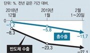 지난해 12월부터 시작된 수출 감소세가 올 2월까지 이어지고 있다. 수출 감소 폭이 점점 커지면서 글로벌 반도체 수요 감소에서 촉발된 수출 부진이 심해지고 있다는 분석이 나온다. 21일 관세청에 따르면 이달 1∼20일 총수출액은 233억3100만 달러로 전년 같은 기간에 비해 11.7% 감소했다. 조업일수를 고려한 하루 평균 수출액 역시 18억7000만 달러로 1년 전보다 8.2% 줄었다. 올해 2월 1∼20일 조업일수는 12.5일로 지난해 같은 기간(13.0일)보다 0.5일 적다. 현 추세대로라면 지난해 12월 이후 3개월 연속 수출 감소세를 보일 가능성이 높다. 2015년 1월부터 2016년 7월까지 19개월 연속 수출이 감소한 이후 처음 3개월 이상 수출 부진 추세가 이어지는 것이다. 품목별로 보면 이달 20일까지 반도체 수출액이 전년 동기 대비 27.1% 감소해 가장 큰 폭으로 실적이 악화했다. 이어 석유제품(―24.5%), 선박(―7.5%) 등의 수출 감소 폭이 컸다. 국가별로는 대(對)중국 수출이 전년 동기 대비 13.6% 감소한 것으로 나타났다. 유럽연합(EU)으로의 수출도 18.2% 감소했다. 반면 미국으로의 수출은 11.3% 늘었다. 지난해 12월 총수출액이 1.2% 감소한 이후 수출 감소 폭은 점점 커지고 있다. 1월 수출액은 전년 같은 달 대비 5.8% 감소했다. 반도체 수출 역시 12월 8.3% 감소한 뒤 1월 23.3% 감소해 부진이 심화하고 있다. 이처럼 수출이 부진한 것은 미국과 중국의 무역분쟁 등 대외 통상 여건이 악화하고 있는 데다 세계의 공장이자 시장인 중국의 경기가 둔화하고 있어서다. 여기에 반도체 가격과 국제유가가 하락하면서 반도체와 석유제품 분야에서 타격을 입은 것도 부진의 원인이다. 정부 관계자는 “반도체 가격과 유가가 하반기 회복될 것으로 예상돼 수출 실적도 개선될 것으로 보인다”고 내다봤다. 정부는 무역금융 확대, 수출 마케팅 지원 강화 등을 골자로 한 ‘수출활력 제고대책’을 이달 내 발표할 예정이다.세종=이새샘 기자 iamsam@donga.com}