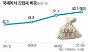 저소득층에게 상대적으로 더 큰 세금 부담을 주는 간접세 비중이 계속 증가하는 것으로 나타났다. 24일 기획재정부와 국세청에 따르면 국세에서 간접세가 차지하는 비중은 2007년 47.3%, 2008년 48.3%, 2009년 51.1%로 3년 연속 증가했다. 올해도 간접세 비중은 52.1%로 지난해보다 커질 것으로 예상된다. 간접세는 일반적으로 세금을 낼 의무가 있는 사람과 실제 부담하는 사람이 다른 경우가 많은 세금으로 부가가치세, 특별소비세, 주세, 인지세, 증권거래세 등이 포함된다. 간접세가 저소득층에게 더 큰 부담을 주는 이유는 종합부동산세, 법인세, 상속·증여세 같은 직접세가 소득에 부과되는 것과 달리 간접세는 소비에 부과되기 때문이다. 특히 간접세 중 가장 규모가 큰 부가가치세는 2007년 40조9419억 원에서 올해 49조5450억 원으로 21.0% 증가한 것으로 나타났다. 이세형 기자 turtle@donga.com}