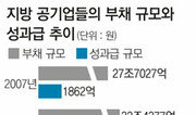 서울시 산하 공기업인 SH공사는 지난해 기준으로 16조3455억 원에 달하는 ‘부채 폭탄’을 안고 있다. 이는 2008년에 비해 부채가 무려 5조5365억 원이나 늘어난 것이다. 같은 기간에 부채비율도 369.3%에서 505.5%로 136.2%포인트 높아졌다. 부채가 크게 늘었지만 이 회사의 임직원은 지난해 54억3264억 원의 성과급을 받았다. 사장은 1375만 원, 임원과 직원은 각각 1인당 평균 2187만 원과 837만 원을 받은 것이다. 경기 양평군 산하의 양평지방공사의 작년 말 기준 부채 비율은 7868%로 지방 공기업 가운데 가장 높다. 이 회사는 2008년 14억 원의 적자를 냈고 지난해에도 25억 원의 적자를 기록했다. 어마어마한 부채비율 속에 적자폭도 커졌지만 이 회사의 사장은 지난해 성과급으로 1237만 원을 받았고 직원에게도 성과급이 지급됐다.○ 대형 사업 중단돼도 성과급은 지급 광역지자체 산하 16개 도시개발공사의 부채 규모는 34조9820억 원으로 전체 지방 공기업 부채(42조6800억 원)의 약 82%를 차지한다. 평균 부채 비율도 347.1%로 전체 지방 공기업의 평균 부채비율(132.8%)을 크게 웃돈다. 특히 상당수 도시개발공사가 추진했던 대형 개발 프로젝트는 2008년 하반기 글로벌 금융위기가 터지면서 어려움을 겪었고 최근에는 부동산 가격 하락 현상의 영향을 받고 있다. 이런 상황에서도 도시개발공사의 성과급 지급 행진은 멈추지 않았다. 강원도개발공사는 1조5000억 원을 투자한 ‘알펜시아 리조트’가 분양에 실패하며 자금 부족으로 공사를 멈췄고 하루에 이자로만 1억 원을 써야 하는 상황에서도 성과급을 지급했다. 지난해 이 회사는 총 6억6426만 원의 성과급을 지급해 임원과 직원 1인당 각각 평균 717만 원과 512만 원의 성과급을 받았다. 광역지자체 산하 개발공사 중 SH공사 다음으로 부채비율이 높은 경남개발공사(441%)와 경기도시공사(393%)도 2007∼2009년 매해 성과급을 지급했다. 매년 수천억 원의 적자를 기록 중인 지하철공사도 성과급 지급에는 적극적이었다. 서울메트로는 지난해 2374억 원의 적자를 냈지만 사장은 3063만 원, 임원은 1557만 원(평균), 직원은 532만 원(평균)의 성과급을 받았다. 서울도시철도공사 역시 지난해 2140억 원의 적자를 냈지만 사장은 4627만 원, 임원은 2413만 원(평균), 직원은 653만 원(평균)의 성과급을 받았다.○ 평가 시 비중 낮은 경영실적 평가 부채가 많은 지방 공기업이 임직원에게 후하게 성과급을 지급할 수 있는 이유는 행정안전부의 ‘지방공기업 경영평가’에서 경영실적과 관련된 점수가 너무 낮기 때문이다. 지난해까지 도시개발공사 평가의 경우 100점 만점에 영업수지비율과 부채비율 관련 점수는 각각 8점과 4점에 불과했다. 지하철공사 역시 영업수지비율에 대한 배점이 100점 만점에 5점밖에 안 되고 부채비율 배점은 아예 없었다. 임동규 한나라당 의원은 “올해부터 도시개발공사와 지하철공사 영업수지비율 배점이 각각 15점과 10점으로 늘어났지만 이 역시도 정확한 재정 상태를 반영하기에는 너무 부족한 점수”라고 지적했다. 행안부 관계자는 “지자체 산하 도시개발공사에 대한 일제 재무상태 점검을 대형회계법인을 통해 진행 중”이라며 “11월 말에 결과가 나오면 더욱 구체적인 경영평가 및 구조개선 조치를 취하겠다”고 말했다.이세형 기자 turtle@donga.com}