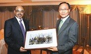 성완종 경남기업 회장(오른쪽·에티오피아 명예총영사)이 29일 부산 롯데호텔에서 세계개발원조총회 참석차 방한한 멜레스 제나위 에티오피아 총리에게 동양화 한 폭을 선물로 전달하고 있다. 성 회장은 제나위 총리와 에티오피아의 경제개발 5개년 계획 참여 등을 논의했다. 경남기업 제공}