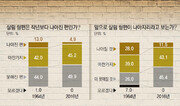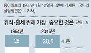 ‘한국 사회에서 성공하려면 필요한 게 무엇일까?’ ‘잘살아 보자’는 일념으로 밤낮을 가리지 않고 땀 흘렸던 아버지 세대들은 당연히 실력이라고 믿었다. 동아일보가 1964년 12월 전국 성인 남성 1020명을 대상으로 실시한 민생 관련 여론조사에서 이런 아버지 세대의 믿음은 고스란히 드러났다. 당시 ‘취직이나 출세를 하려면 연줄, 돈, 실력 중 어느 것이 중요한가’라는 다소 도발적인 질문에 아버지 세대들은 ‘실력’(49%)이라고 대답했다. 1964년은 1인당 국민총소득(GNI)이 107달러로 2015년(2만7340달러)의 256분의 1에 불과했던 때였다. 먹고살기 힘들어도 땀 흘려 실력을 갖추면 성공할 수 있다는 자신감과 공정한 기회에 대한 확신이 있었다. 아버지 세대는 ‘내 자식만큼은 열심히 공부해 실력만 갖추면 나보다는 잘살겠지’라는 믿음도 있었다. 이런 믿음은 그해 수출액 1억 달러 돌파라는 성과로 이어졌고, 대한민국을 전쟁의 폐허 더미에서 세계 경제 10위권의 대국으로 만들어 내는 원동력이 됐다. 50여 년이 지난 요즘은 어떨까. 동아일보는 한국개발연구원(KDI)과 함께 지난해 12월 전국 성인 1000명에게 같은 질문을 던졌다. 결과는 그때와 달랐다. ‘혈연, 지연, 학연 등의 인맥’을 꼽은 응답은 36.8%로 증가한 반면 ‘실력’은 33.8%로 떨어졌다. 국정 농단 사태의 주인공 최순실 씨의 딸 정유라 씨가 “돈도 실력이야”라고 했던 것도 이런 사회 분위기의 단면이다. 기회 균등에 대한 국가 시스템의 불신이 커지면서 능력주의 사회를 기대하는 믿음이 크게 후퇴한 것이다. 미래 살림이 좋아질 거란 기대감도 50여 년 전보다 오히려 줄었다. 1964년 조사에선 ‘살림살이가 앞으로 나아질 것인가’라는 질문에 응답자의 28%가 ‘그렇다’고 답했다. 반면 이번 조사에선 11.5%만 긍정적으로 봤다. ‘그렇지 않다’는 부정적인 답변은 1964년 26%에서 지난해 45.4%로 크게 늘었다. 경제 전문가들은 소득이 일정 수준을 넘으면 행복감이 소득에 비례해 높아지지 않는 ‘진보의 역설’이 나타난다고 말한다. 하지만 경기 회복에 대한 기대감은 물론 실력으로 성공할 수 있다는 믿음조차 약해진 한국의 현실을 어떻게 이해해야 할까. 지용희 서강대 명예교수는 “불공정 경쟁을 체감하는 국민들의 분노에 정부와 정치권이 응답하지 않으면 한국의 미래는 더 어두워질 것”이라고 걱정한다. 김성모 mo@donga.com / 세종=이상훈 기자}