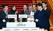 16일 청와대에서 열린 문재인 대통령과 중소·벤처기업 및 소상공인과의 대화에는 박성택 중소기업중앙회 회장, 안건준 벤처기업협회 회장 등 기업가 32명이 참석했다. 환담에 앞서 문 대통령과 참석자들이 평창 겨울올림픽과 새 정부 경제정책의 성공을 기원하며 케이크를 꾸미는 행사를 가졌다. 평창 올림픽 마스코트인 ‘수호랑’ ‘반다비’ 인형으로 장식된 케이크에 참석자들과 문 대통령이 ‘사람중심’ ‘혁신창업’ ‘성공’이라고 쓰인 깃발을 꽂았다. 청와대는 이날 강정완 공사박사 대표, 박종한 펍플 대표 등 재기 기업인 4명을 초청해 재도전을 응원하는 의미로 운동화를 선물했다. 청와대 관계자는 “강 대표는 통신업체 마케팅 대리점을 하다 실패했지만 3년간의 재준비를 거쳐 새로운 사업을 준비하고 있다. 강 대표에게 문 대통령이 중소기업 삼덕통상의 운동화를 선물했다”고 말했다. 삼덕통상의 문창섭 회장도 ‘일자리 우수기업’ 자격으로 참석했다. 환담 뒤 가진 만찬에서는 전복과 문어, 풍천장어와 설렁탕 등이 제공됐다. 청와대는 “열심히 뛰어 달라는 의미를 담았다”고 설명했다. 설렁탕은 1990년부터 매달 노인들에게 설렁탕을 제공하는 등 다양한 봉사활동을 하고 있는 서울 중구 을지로의 ‘문화옥’ 설렁탕이 공수됐다. 건배주로는 병당 20원씩 장학금을 기부하고 장년고용 활성화 정책에 참여하고 있는 ‘가평 잣 막걸리’가 선정됐다. 한상준 기자 alwaysj@donga.com}