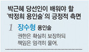 박정희 전 대통령은 ‘인사전략가’로 통한다. 10월 유신으로 독재 체제를 수립한 뒤 서서히 몰락의 길에 들어섰지만, 현재도 장단점을 깊이 따져보고 벤치마킹할 만한 특유의 용인술을 보여줬다. ○ 장수형 용인술박 전 대통령은 현장 지휘관에게 최대한 자율성을 보장하되 전투 결과에 대해서는 철저하게 책임을 묻는 ‘장수형 용인술’을 폈다.경제부총리제를 만들어 경제정책과 관련된 제반 권한을 보장했고, 국면전환용으로 부총리나 장관을 교체하는 일도 많지 않았다. 초대 경제부총리인 장기영 전 부총리는 3년 5개월 동안 재임하며 외자 도입을 주도했다. 남덕우 전 국무총리는 경제부총리 시절 최장수인 4년 3개월 동안 재임하며 중화학공업 육성과 수출 드라이브 정책을 밀고 나갔다.차관 이하 인사권은 원칙적으로 장관에게 있었다. 대통령비서실에서 각 부처에 연락할 때도 국·실장이 아니라 장관에게만 연락하게 해 장관의 권한을 실질적으로 보장했다.그 대신 책임은 엄격하게 물었다. 1960년대 경제개발을 이끌며 ‘불도저’라는 별칭을 얻은 장 전 부총리였지만 삼성계열 한국비료의 ‘사카린 밀수사건’에 대한 대처를 잘못하자 즉각 경질했다. 장·차관 공동운명제도 적용했다. 장관이 데리고 일할 사람으로 차관을 인선하게 한 만큼 차관이 중대한 잘못을 저지를 경우 장관까지 함께 물러나게 했다. 박근혜 대통령 당선인은 선거 과정에서 “총리와 장관에게 헌법과 법률에 따른 실질적 권한을 부여하겠다”고 약속했다. 하지만 김용준 전 국무총리 후보자의 경우 발표되자마자 ‘책임총리’로 적합한 인물이냐는 논란이 일었다. 추후 인선에서는 자율성을 갖고 권한과 책임을 행사할 수 있는 책임총리, 책임장관제에 적합한 인사를 기용해야 한다는 지적이 나온다. ○ 통 큰 용인술5대 대선 이틀 전인 1963년 10월 13일 동아일보는 당시 박정희 공화당 후보가 여수·순천사건 관련 군법회의에서 무기징역을 선고받았던 사실을 호외로 보도했다. 당시 사상 논쟁은 선거의 최대 쟁점이었던 만큼 그는 동아일보에 대해 노골적으로 불편한 감정을 표출했다. 하지만 대통령에 당선된 뒤 그는 초대 국무총리로 최두선 당시 동아일보 사장을 임명했다. 이만섭 전 국회의장은 이 사례를 언급하며 “박 전 대통령의 용인술은 한마디로 폭이 넓었다”고 말했다. 필요하면 정치적으로 반대편에 섰던 인사까지 과감히 발탁했다는 것.이 전 의장은 예편한 이한림 장군을 1969년 건설부 장관에 임명한 것도 박 전 대통령의 ‘통 큰 용인술’을 보여주는 사례로 거론했다. 그는 5·16군사정변 당시 1군사령관으로서 ‘군의 정치 개입 반대’를 외치며 혁명군을 진압하려 했기 때문이다.▼ 5·16 진압하려한 이한림 장군을 장관 임명 ‘통큰 인사’ ▼능력만 있다면 지역적인 연고를 묻지 않고 요직에 기용했다. 박 전 대통령은 전남 영광 출신의 박경원 2군사령관을 내무부 장관을 포함해 세 차례 장관으로 임명했다. 광주 출신인 정래혁 육군사관학교 교장을 국방부 장관에 임명하기도 했다. 박 당선인은 선거 과정에서 ‘인사 대탕평’ 의지를 강조했다. 김대중 전 대통령의 사람이나 대표적인 탈박(脫朴) 인사로 분류됐던 김무성 전 의원을 중책에 기용하기도 했다. 하지만 “15년의 정치 인생 동안 자신을 겨냥해 쓴소리를 하거나 불편한 관계를 겪은 인사들을 끌어안는 포용의 리더십을 보여주는 데는 부족했다”는 평가도 있다. ○ CEO형 용인술현장에서 실무를 관장하는 젊은 인재들을 눈여겨봤다가 직접 발탁하는 것도 ‘박정희 스타일’이었다. 누군가에게 몇 차례 걸러진 인사 정보에만 의존하지 않겠다는 취지다. 동훈 전 국토통일원 차관은 “박 전 대통령은 농림부 농정국장, 내무부 지방국장, 재무부 이재국장 등 당시 주요 정부 부처 핵심 실·국장들의 정책 입안과 실행 역량을 관찰했다”고 전했다. 직접 불러 토론하고 과제를 내기도 했다. 김용환 새누리당 상임고문은 재무부 차관, 대통령경제수석비서관, 재무부 장관 등 ‘계단식 승진’의 대표적 사례. 1967년 12월 재무부 이재국장 시절 “경부고속도로의 건설비 소요액을 산출하라”는 박 전 대통령의 지시를 받고 유류세 신설을 통한 재원 조달 방안까지 마련해 브리핑했다. 예상 밖의 보고에 흡족해한 박 전 대통령은 그때 김 고문을 낙점했다. 신년초도(新年初度) 순시나 국무회의도 실무 인재 발굴의 장으로 활용했다. ○ 교사 용인술“OOO 귀하. 청와대 근무 10년의 노고와 그간의 업적을 높이 치하하며 앞으로도 방가(邦家·국가)를 위해 위국 대성 있기를 기원합니다. 대통령 박정희” 박 전 대통령은 대구사범학교 출신으로 경북 문경보통학교에서 3년 동안 교사생활을 한 경험을 살려 교사 같은 용인술을 선보이기도 했다. 손으로 눌러 쓴 친서를 통해 주위 공직자들에게 각별한 관심이 있음을 나타냈다. 박 전 대통령의 인사 수첩에는 사람에 대한 기록도 빼곡하게 들어 있었다고 한다. 관직을 그만둔 인사에게 “1년 있다가 연락할 테니 좀 쉬고 있으라”고 한 뒤에는 정확히 1년 뒤 연락을 했다. 자리를 다시 주지 못하더라도 “그동안 낚시라도 하라”