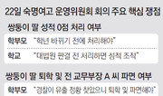 “전 교무부장 A 씨의 쌍둥이 딸이 부정을 저질러서 다른 학생들의 성적이 밀려나게 됐어요. 대법원 판결까지 기다린다면 이미 학생들은 졸업한 뒤예요. 빨리 쌍둥이 딸의 시험 점수를 0점 처리해서 학년이 바뀌기 전에 (성적을) 되찾고 싶다는 겁니다.” 22일 오후 4시경 서울 강남구 숙명여고의 한 회의실. 학교 운영위원회 회의에서 한 학부모가 목소리를 높이며 학교 측에 두 학생의 ‘0점 처리’를 강하게 요구했다. 이날 회의는 교장과 교직원, 학부모 등 10여 명이 참석한 가운데 1시간 반 동안 진행됐다. 시험지 유출 의혹이 이 회의 정식 안건은 아니었지만 학부모들은 이번 사건과 관련해 A 씨와 쌍둥이 딸을 조속히 징계해야 한다고 주장했다. 이에 학교 측은 “대법원의 최종 판결이 나오기 전까지 교칙상 조치를 할 수 없다. 기다려 달라”는 말을 되풀이하며 설전이 오갔다.○ “3학년 전 0점 처리” vs “대법원 판결 기다려야” 본보가 단독 입수한 숙명여고 운영위원회 회의 녹취 파일에 따르면 학부모들이 가장 강력하게 요구한 부분은 학년이 바뀌기 전에 현재 2학년인 쌍둥이 딸의 점수를 0점 처리해야 한다는 점이다. ‘A 씨를 파면해야 한다’ ‘학교 측이 공식 사과문을 발표해야 한다’고 주장하는 학부모도 있었다. ‘강남 8학군’에 위치한 숙명여고의 내신 경쟁은 치열하다. 문·이과 전교 1등인 쌍둥이 딸의 성적이 0점 처리된다면 다른 학생들은 등수가 올라가 내신 등급이 바뀔 수 있다. 회의에 참여한 학부모 B 씨는 “내신 등급의 경계선에 있는 학생들은 등수 하나 차이로 등급이 바뀔 수 있고, 갈 수 있는 대학이 완전히 달라진다”고 말했다. 그래서 올해 두 학생의 성적을 0점 처리해야 내년에 수시 지원을 할 때 다른 학생들에게 유리하다는 게 학부모들의 생각이다. 학부모 C 씨는 “퇴학은 나중에 시키더라도 성적 정정만큼은 학년이 바뀌기 전에 해야 한다”고 주장했다. 반면 교장은 “대법원 판결 전까지 학교가 징계할 근거가 없다. 그 전에 학교가 임의대로 (0점 처리하는 것은) 성적 조작이 된다”고 말했다. ○ 시교육청 “확정 판결 전 쌍둥이 딸 징계 가능” 두 학생에 대한 징계는 교직원 5∼10명으로 구성되는 학교 선도위원회(선도위)에서 결정한다. ‘2018년 숙명여고 학생생활지도 징계기준’에는 ‘고사 중 부정행위를 했거나 동조한 학생’은 해당 시험을 0점 처리하도록 돼 있다. 이를 근거로 서울시교육청 관계자는 “수사 결과를 통해 명백한 부정행위가 드러나고 학생 과실이 입증되면 0점 처리가 가능하다”고 말했다. 실제 7월 광주의 한 고교에서도 학교 운영위원장 D 씨가 시험지를 빼돌려 자녀에게 건넨 것이 밝혀지자 학교 측에서 자녀의 시험 점수를 0점 처리했다. 또 쌍둥이 딸의 징계와 관련해 학교 측은 “학생생활지도 징계기준에 따라 ‘형법상 유죄로 판결된 학생’에 대해서만 퇴학 처분이 가능하다”고 말했다. 하지만 징계 기준에는 ‘부정행위를 목적으로 시험 문제를 사전에 절취하거나 절취 후 누설한 학생’에 대해 최대 퇴학 조치가 가능하다는 조항도 있다. 서울시교육청 관계자는 “선도위는 법원 판결과 별개로 퇴학 여부를 결정할 수 있다”고 밝혔다. 하지만 교장은 23일 본보에 보낸 문자메시지에서 “학부모들의 마음은 이해가 되지만 규정상 ‘형법상 유죄가 확정된 경우 퇴학’이다. 위법을 하며 처벌할 수는 없지 않겠느냐”며 ‘유죄 확정 뒤 징계’ 방침을 고수했다.구특교 기자 kootg@donga.com}
