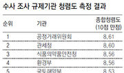 수사나 조사, 규제를 담당하는 13개 공공기관 가운데 검찰청의 청렴도가 가장 낮은 것으로 평가됐다. 국민권익위원회가 12일 발표한 ‘2011년 수사·조사·규제기관 청렴도 측정 결과’에 따르면 종합청렴도(10점 만점)에서 검찰청이 7.53점으로 최하위로 나타났으며 이어 농림수산식품부(8.03), 경찰청(8.08) 순이었다. 반면 공정거래위원회는 8.61로 청렴도가 가장 높았고 관세청(8.60), 식품의약품안전청(8.56)도 청렴도가 높은 것으로 조사됐다. 지난해와 비교할 때 청렴도 점수가 가장 많이 오른 곳은 고용노동부(+0.26), 가장 많이 떨어진 곳은 농식품부(―0.60)였다. 13개 기관 평균은 8.35점으로 지난해보다 0.22점 낮아졌다. 권익위는 외부청렴도(민원인이 평가)와 내부청렴도(소속 직원이 평가)를 합산하고, 부패행위 징계자와 청렴도 측정 시 신뢰도 저해 행위에 대한 감점을 종합해 종합청렴도를 평가했다. 검찰청과 국세청은 내부청렴도보다 외부청렴도가 크게 낮았다. 이들 기관 직원 스스로는 청렴도를 높게 평가했지만 외부의 시각은 달랐다는 뜻이다. 반면 방송통신위원회와 환경부는 외부청렴도보다 내부청렴도가 훨씬 낮아 내부 직원들이 자기 기관의 청렴도에 인색한 점수를 준 것으로 나타났다. 권익위가 올해 시범적으로 도입한 전문가 및 업무 관계자(학계, 국회, 감사원, 시민단체 등)의 평가에서는 금융감독원(5.90)이 가장 낮았고 관세청(8.74)이 가장 높았다. 권익위는 지난해까지는 전체 공공기관에 대한 청렴도 측정 결과를 일괄 발표했지만 ‘업무 특성이 다른 기관들의 청렴도를 한꺼번에 발표하는 것은 형평성에 문제가 있다’는 지적에 따라 올해는 수사·조사·규제기관을 먼저 발표했다. 나머지 중앙행정기관, 지방자치단체, 교육청, 공기업 등 670개 기관에 대한 청렴도 측정 결과는 12월 발표할 예정이다.장택동 기자 will71@donga.com}