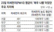 23일에 이어 25일에도 심각한 수준의 미세먼지(PM10)가 한반도를 덮칠 것으로 전망된다. 국립환경과학원은 “황사의 영향으로 25일 서해안 지역을 중심으로 전국에 걸쳐 미세먼지 농도가 ‘매우 나쁨’(m³당 151μg 이상) 수준을 보이겠다”며 각별히 건강관리에 유의해 줄 것을 당부했다. 미세먼지 농도가 ‘매우 나쁨’ 수준으로 2시간 이상 이어질 때 발령되는 미세먼지주의보가 전국 대부분 지역에 적용될 것으로 보인다. 또 m³당 300μg(마이크로그램·1μg은 100만분의 1g) 농도가 2시간 이상 이어져 경보가 발령되는 곳도 적지 않을 것으로 전망된다. 이날 아침 최저기온은 5∼13도로 전날과 비슷하고 낮 최고기온은 19∼27도를 나타내겠다. 중국발 황사의 영향으로 올해 들어 최악의 미세먼지가 나타난 23일 인천과 충남 지역은 하루 동안 평균 미세먼지 농도가 각각 m³당 209μg과 213μg에 이르렀다. 경기 지역 역시 이날 평균 미세먼지 농도가 m³당 201μg을 기록했다. 세계보건기구(WHO)는 미세먼지 농도를 m³당 50μg 이하로 낮춰서 관리할 것을 권고하는데, 이들 지역은 기준치에 비해 4배 정도 대기 질이 나빴던 것이다. 분지 지형으로 대기 정체 현상을 보인 대구 역시 이날 평균 미세먼지 농도가 m³당 206μg을 기록했다. 서울 지역의 미세먼지주의보는 24일 낮 12시에 해제됐다. 미세먼지 농도가 m³당 100μg 이하로 떨어지면 주의보를 자동으로 해제하는데 정오를 기점으로 97μg까지 떨어졌기 때문이다. 갑작스럽게 미세먼지주의보가 해제됐다는 소식에 예정됐던 일정을 포기했던 시민들은 불만의 목소리를 내기도 했다. 반면 심각한 미세먼지에도 불구하고 서울에서 신문사 주최로 하프마라톤 대회가 열리는 등 각종 야외 행사가 진행돼 비판이 제기되기도 했다.임현석 기자 lhs@donga.com}