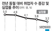 지난달 취업자 수가 8년 1개월 만에 가장 큰 폭으로 늘었고, 실업률도 2008년 11월 이후 가장 낮은 수치를 보이면서 고용시장에 훈풍이 불고 있다. 9일 통계청의 ‘5월 고용동향’에 따르면 지난달 취업자 수는 2430만6000명으로 1년 전보다 58만6000명 늘어 64만6000명 증가했던 2002년 4월 이후 최대 증가폭을 나타냈다. 전년 동월 대비 취업자 수는 글로벌 금융위기의 후폭풍이 불기 시작한 2008년 12월에 1만2000명이 감소한 뒤 지난해 5월까지 매달 줄었다. 이후 감소와 증가를 반복하다가 올해부터 매달 증가 폭이 커지고 있다. 기획재정부는 경기회복세가 강해지면서 기업들의 수출이 증가해 민간 부문의 일자리가 많아지고 있는 것으로 분석하고 있다. 지난달 민간부문 취업자 수는 전년 동월에 비해 51만7000명 늘어나 2002년 7월 이후 가장 큰 폭으로 증가했다. 민간부문 취업자 수는 2월 14만2000명, 3월 19만2000명, 4월 30만3000명 등으로 증가폭이 뚜렷하다. 재정부 관계자는 “경기회복세가 지속됨에 따라 민간 부문의 고용 증가 현상이 하반기에도 이어질 것으로 보인다”며 “고용 여건과 고용의 질도 계속 좋아질 것”이라고 전망했다. 지난달 3.2%를 기록해 2개월 연속 3%대를 보인 실업률 역시 하락세가 이어지고 있다. 올해 1월 실업률은 5.0%였지만 2월 4%대로 떨어졌고, 4월부터 3%대를 유지하고 있다.이세형 기자 turtle@donga.com}