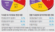 4일 방영된 첫 대선 TV토론은 조사 대상의 68.3%가 ‘대부분 또는 일부를 시청했다’고 답했다. ‘직접 보지는 않았지만 언론보도 등을 통해 내용을 파악하고 있다’라는 응답자는 13.4%였다. 시청하지 않았고 내용도 모른다고 답했거나, 아예 응답하지 않은 이들은 18.3%에 불과했다. TV토론에 대한 높은 관심이 수치로 나타난 것이다.○ 토론 누가 잘했나? ‘박-이-문’순토론을 봤거나 내용을 파악하고 있다는 응답자를 대상으로 어느 후보가 토론을 더 잘했는지를 묻자 새누리당 박근혜 후보라는 응답이 33.7%로 가장 많았다. 통합진보당 이정희 후보가 23.1%로 뒤를 이었으며 민주통합당 문재인 후보는 20.7%에 그쳤다. 문 후보에 대한 평가가 박하게 나온 것은 토론 내내 이 후보가 박 후보를 공격하면서 비교적 점잖은 모습을 보인 문 후보의 존재감이 부각되지 않았기 때문으로 풀이된다. 박 후보 지지층의 64.4%는 박 후보가 토론을 가장 잘했다고 평가했으나, 문 후보 지지층에서는 이 후보가 잘했다는 응답(39.7%)이 문 후보가 잘했다는 응답(37.8%)보다 근소하게 많았다. 문 후보는 자신의 지지층에서도 제대로 평가를 못 받은 셈이다. 이에 따라 TV토론을 통해 지지율 격차를 극복하겠다던 문 캠프의 전략은 일단 실패한 것으로 보인다.연령이 높을수록 박 후보가 잘했다는 응답이 많았고, 연령이 낮을수록 이 후보가 잘했다는 답변이 많았다. 이념성향별로 보면 보수층은 절반 이상(54.2%)이 박 후보가 잘했다고 답했으며 중도층에서도 박 후보가 잘했다는 답변이 29.1%였다. 진보층에서는 이 후보가 잘했다는 응답이 35.9%로 문 후보(32.3%)를 앞질렀다.지역별로는 호남을 뺀 모든 지역에서 박 후보가 잘했다는 답변이 많았다. 호남에선 이 후보가 잘했다는 응답(36.4%)이 문 후보가 잘했다는 응답(32.5%)을 앞질렀다.○ TV토론 후 지지 후보 변경 6.7%TV토론이 각 후보의 지지율에 미친 영향력은 크지 않을 것으로 분석됐다. ‘TV토론회를 보고 지지 후보를 변경할 생각이 들었느냐’라는 질문에 응답자의 89.1%는 ‘변경할 생각이 없다’라고 답했다. ‘변경할 생각이 들었다’라는 이들은 6.7%에 불과했다. 박 후보 지지자의 93.5%, 문 후보 지지자의 91.9%가 지지 후보를 변경할 생각이 없다고 밝혀 이미 각 후보 지지층이 결집된 상태임을 보여 줬다. 새누리당 지지자의 92.4%, 민주당 지지자의 90.2%도 현재 지지하는 후보를 계속 지지하겠다고 밝혔다. 지역별로는 강원·제주에서 변경할 생각이 들었다는 답변이 13.0%로 좀 높게 나왔지만 새누리당과 민주당의 텃밭인 대구·경북과 호남에선 변경 의사를 밝힌 이들이 각각 2.6%와 6.4%에 그쳤다. ○ 토론 방식 개선 목소리 대선후보의 지지율이 1% 미만이라도 소속 정당 국회의원이 5명 이상이면 참여할 수 있는 현행 TV토론 방식에 대해서는 ‘현행 방식을 개선할 필요가 있다’라는 의견이 과반(58.5%)이었다. 이 후보로부터 맹공격을 받았던 박 후보의 지지층 59.3%가 개선이 필요하다고 답했으며, 문 후보 지지층 57.2%도 제도 개선에 긍정적인 반응을 보였다. 새누리당 지지자(60.1%)보다 민주당 지지자(63.0%) 사이에서 토론 자격을 변경해야 한다는 목소리가 약간 높았다. 또 진보층(58.4%)보다는 보수층(63.5%)과 중도층(63.2%)에서 제도 개선의 필요성에 대한 공감대가 컸다.장원재·손영일 기자 peacechaos@donga.com}
