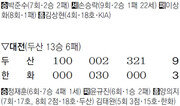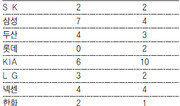 갈 길이 먼 디펜딩 챔피언 KIA가 넥센에 패하면서 4위 롯데와의 승차를 줄이는 데 실패했다. KIA는 29일 광주에서 열린 넥센과의 홈경기에서 4안타의 빈타에 허덕이며 2-3으로 패했다. KIA는 1회 최희섭의 희생플라이로 먼저 점수를 뽑았으나 3회 2실점하면서 역전을 허용했다. KIA는 돌아온 홈런왕 김상현이 4회 솔로포를 터뜨리며 다시 동점을 만들었지만 8회 유한준에게 적시타를 얻어맞고 무너졌다. 이 경기에서 KIA 이용규는 8회 넥센 두 번째 투수 박준수를 상대로 투구 수 20개를 기록해 이 부문 역대 최다 기록을 세웠다. 종전 기록은 2008년 9월 24일 당시 두산 소속이던 정원석이 장원삼을 상대로 기록한 17개. 이용규는 파울 15개를 기록하며 끈질긴 승부를 펼쳤으나 우익수 뜬공으로 물러났다. 선두 SK는 사직에서 롯데 마운드를 장단 12안타로 두들기면서 8-5 승리를 거두고 이날 비로 LG와의 잠실 경기가 취소된 2위 삼성과의 승차를 2.5경기로 벌렸다. SK는 2-2로 맞선 3회 최정의 2타점 2루타 등으로 3점을 뽑으며 달아난 뒤 4회 김재현의 1점 홈런과 5회 김강민의 적시타로 착실히 점수를 추가하면서 승부를 갈랐다. 롯데 이대호는 3타수 무안타에 그쳐 22일 두산전에서 41호 홈런을 기록한 이후 4경기 연속 홈런포가 침묵을 지켰다. 5연승을 달리던 롯데 선발 김수완은 3과 3분의 2이닝 동안 6실점(3자책)하면서 시즌 첫 패배를 당했다. 롯데는 5위 KIA와의 승차를 5.5경기로 유지했다. 두산은 유력한 신인왕 후보 양의지의 연타석 홈런을 앞세워 한화를 9-3으로 꺾고 3연패에서 벗어났다. 두산은 1-3으로 끌려가던 6회 김동주와 최준석의 연속 적시타로 동점을 만든 뒤 7회 양의지의 솔로포와 김동주의 2타점 2루타로 전세를 뒤집었다. 이종석 기자 wing@donga.com}