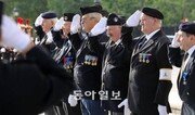 6·25전쟁에 참전했던 프랑스 노병들이 13일 이명박 대통령이 파리 개선문 참전용사비 앞에서 헌화하는 동안 거수경례를 하고 있다. 파리=김동주 기자 zoo@donga.com}