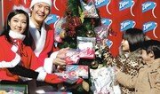 한국존슨 지퍼락이 20일 서울 중구 명동 거리에서 자사의 ‘지퍼락 홀리데이백’에 크리스마스 선물을 넣어 어린이들에게 나눠주고 있다. 이 제품은 냉장고에 식품을 보관할 때 사용하는 투명 백이다. 변영욱 기자 cut@donga.com}