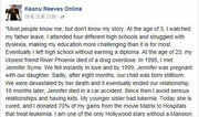 “많은 사람들이 날 알지만, 내 이야기는 모른다.” 글은 이렇게 시작됩니다. 지나온 삶이 담담하게 이어지죠. “세 살 때 아버지가 떠났다. 고등학교를 4곳이나 옮겨 다녔고 난독증 때문에 애를 먹었다. 결국 고등학교 졸업장을 받지 못했다. 가장 가까웠던 친구 리버 피닉스는 23세 때 약물 과다 복용으로 숨을 거뒀다. 1998년 제니퍼 사임을 만났다. 이듬해 그녀는 딸아이를 임신했다. 불행히도 우리 아이는 여덟 달 만에 숨진 채 세상에 나왔다. 끝내 그녀와의 관계는 끝을 맺었다. 18개월 뒤 사임도 교통사고로 세상을 떠났다. 그 이후 난 아이를 가지는 것도, 진지한 관계도 피하게 됐다. 지금은 완치됐지만 여동생은 백혈병을 앓았다. 나는 영화 ‘매트릭스’로 번 돈의 70%를 백혈병을 치료하는 병원에 기부했다. 난 대저택이 없는 할리우드 스타 중 한 명이다. 보디가드도 없고 값비싼 옷도 입지 않는다. 몸값이 1억 달러(약 1149억5000만 원)지만 난 여전히 지하철을 탄다.” 글 속의 ‘나’는 ‘매트릭스’에서 인류를 구원하는 키아누 리브스(51)입니다. 마지막은 용기와 희망을 줍니다. “그래서 난 결국에는 우리 모두 동의할 수 있을 것이라고 생각한다. 비극과 마주친 상황에서도 빛나는 사람은 성장할 수 있다고. 당신의 삶에 무슨 일이 있든지 극복할 수 있다. 삶은 살아볼 만하다.” 22일 페이스북(사진)에 올라온 이 글에 ‘좋아요’를 누른 사람은 불과 하루 만에 140만 명을 넘었습니다. 공유는 40만 번에 육박했고 댓글은 약 6만8000개나 달렸지요. 한 아버지는 “병실에 앉아 글을 읽고 있다”며 댓글을 달았습니다. 자살을 시도한 17세 아들 곁을 지키고 있는 그는 “아들에게 이 글을 크게 읽어 줄 수만 있다면 얼마나 좋을까…”라고 적었습니다. 댓글에 대한 댓글도 이어졌습니다. 2007년 크리스마스에 암 선고를 받았다는 한 남성이 “삶은 진정 살아볼 만하다. 하루하루가 소중히 여겨야 할 선물이다”라고 올린 댓글에 달린 댓글도 1000개에 이르렀습니다. 아버지, 어머니, 할머니, 할아버지, 친구들. 많은 사람들이 암으로 소중한 사람을 잃은 경험을 털어놨습니다. 몇몇 언론 매체는 “리브스가 자신의 페이스북에 자신의 인생을 되돌아보는 글을 올려 잔잔한 감동을 줬다”고 전하기도 했습니다. 하지만 24일 글은 삭제됐습니다. 글이 올라왔던 ‘키아누 리브스 온라인(Keanu Reeves Online)’ 계정을 다시 들어가 봤지만 해당 글을 찾을 수 없었습니다. “친구에게 보여주기 위해 공유해 놨던 글이 보이지 않는데 삭제한 것이냐”는 문의도 올라왔습니다. 25일에는 계정 이름 앞에 ‘비공식(Unofficial)’이라는 단어 하나가 추가됐습니다. 누군가 남겨 놓은 글이 눈에 들어왔습니다. “그래서 다 ‘헛소리’라는 거네. 리브스가 아니었어.” 계정은 리브스의 팬 페이지였습니다. 운영자도 억울한 부분이 있을 수 있습니다. 페이지 정보에 “우리는 실제 키아누 리브스와 아무런 관련이 없다. 단지 읽은 내용들을 인용할 뿐이다”라고 적어 놨기 때문입니다. 미처 그것까지 보지 못한 많은 사람들이 리브스가 올린 글이라고 생각했던 것이지요. 그렇다면 글의 내용은 사실일까요. 리브스의 삶은 진짜입니다. 아버지는 세 살 때 그를 버렸고 그는 난독증을 앓았으며 사랑하는 그의 연인은 딸을 사산했습니다. 연인마저 딸아이 곁으로 떠났습니다. 하지만 덧붙여진 말들은 거짓말일 가능성이 높습니다. “난 대저택이 없는 할리우드 스타 중 한 명이다”부터 그 이후의 문장들은 원 출처를 확인할 수 없었습니다. 몇 년 전 리브스가 덥수룩하게 수염을 기른 채 노숙자처럼 거리를 배회하는 모습이 카메라에 포착된 적이 있습니다. 가장 최근에 찍힌 모습은 어떨지 검색을 해봤습니다. 액션영화 ‘존 윅 2’ 촬영 현장에서 정장을 잘 차려입은 리브스의 사진이 몇 장 떴습니다. 이번 주 미국 뉴욕에서 촬영된 사진들이었습니다. “삶은 살아볼 만하다”는 말이 ‘헛소리’라도 실망할 필요는 없을 것 같습니다. 그 이후에도 해당 계정에는 “당신은 진정한 영감을 주는 사람이다”라는 내용의 글들이 계속 올라오고 있습니다. 그 모든 비극을 겪은 뒤에도 여전히 자신에게 주어진 일에 충실한 지금 리브스의 모습이 곧 그가 우리에게 건네는 말일 것이라고 많은 이들이 믿기 때문은 아닐까요.박희창 디지털퍼스트팀 기자 ramblas@donga.com}