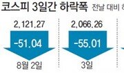 코스피가 사흘 연속 2%대의 급락세를 이어가면서 2008년 ‘리먼 사태’ 이후 가장 큰 폭의 폭락세를 보였다. 미국 증시와 일본 등 아시아 증시는 상승세로 돌아섰지만 한국 증시는 외국인의 계속된 ‘팔자’ 공세에 속절없이 떨어졌다. 4일 코스피는 미국 ‘경기회복 후 침체(더블딥)’ 징후의 그늘을 피하지 못한 채 전날보다 47.79포인트(2.31%) 급락한 2,018.47로 마감하면서 2,000 선 붕괴 개연성을 높였다. 주가는 2일 이후 사흘간 153.84포인트 하락했다. 이는 글로벌 금융위기가 진행되던 2008년 10월 23일부터 3거래일 동안 188포인트 떨어진 이후 최대 하락폭이다. 이날 유가증권시장에서 26조9274억 원의 시가총액이 감소하는 등 사흘간 86조6000억 원이 공중으로 사라졌다. 이 기간 삼성전자의 시가총액이 7조2177억 원, 현대차 5조8373억 원, LG화학 3조7506억 원이 각각 감소하는 등 수출 대형주 중심으로 주가 하락폭이 컸다. 국내 주가는 3일(현지 시간) 미국 다우존스산업평균지수가 0.25% 상승하는 등 뉴욕 증시가 소폭 반등한 영향으로 오전에는 소폭 오름세를 보였지만 외국인들이 오후 들어 ‘팔자’세로 돌아서면서 순식간에 2,000 선까지 위협받았다. 외국인은 4일 4438억 원어치를 순매도하는 등 사흘간 1조5963억 원어치를 팔아치웠다. 전날 동반 하락했던 아시아 증시는 중국 상하이종합지수가 0.13%, 일본 닛케이평균주가가 0.23% 상승하는 등 대체로 오름세를 보였다.박선희 기자 teller@donga.com}