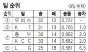 동부가 하승진 없는 ‘이빨 빠진 호랑이’ KCC를 꺾고 공동 3위로 올라섰다. 동부는 9일 전주에서 열린 KCC와의 방문 경기에서 김주성의 맹활약을 앞세워 80-71로 이겨 4연승을 달렸다. 30승(14패) 고지에 올라선 동부는 KCC와 어깨를 나란히 하며 공동 3위가 됐다. 1위 모비스(32승 12패)를 포함한 상위 네 팀의 승차가 2경기 이내로 좁혀져 선두 다툼이 더욱 치열해질 것으로 보인다. 김주성은 하승진이 올스타전에서의 종아리 부상으로 빠진 KCC의 골밑을 휘젓고 다니며 승리에 앞장섰다. 김주성은 양 팀 최다인 22점을 넣었고 리바운드도 11개를 잡아냈다. 어시스트(7개) 3개가 모자라 이번 시즌 자신의 두 번째 트리플 더블을 아깝게 놓쳤다. 동부는 이광재(14득점), 조나단 존스(12득점), 마퀸 챈들러(11득점) 등 주전들이 고르게 득점에 가세했다. 하승진의 공백으로 7일 모비스전에서 이번 시즌 팀 최다 점수차(22점) 패배를 당하며 체면을 구겼던 KCC는 지난해 11월 14일 삼성전 패배 이후 87일 만에 연패에 빠졌다. 3쿼터 3분경부터 10점 차 리드를 허용한 뒤 줄곧 끌려가던 KCC는 4쿼터 4분가량을 남기고 강병현의 3점포로 67-69로 2점 차까지 추격했으나 승부를 뒤집지는 못했다. 4쿼터 막판 아이반 존슨이 결정적인 순간마다 실책을 저질러 공격의 맥을 끊은 데다 자유투가 부진한 게 패인이 됐다. 존슨은 팀 실책(15개)의 절반에 가까운 7개의 실책을 남발했고 KCC는 17개의 자유투를 얻었지만 9개만 넣었다. 하승진의 대타로 나선 KCC 강은식은 데뷔 후 첫 두 자릿수 득점(16득점)을 기록하며 분전했으나 팀 패배로 빛이 바랬다. 부산에서는 홈팀 KT가 트리플 더블을 기록한 제스퍼 존슨을 앞세워 SK를 86-71로 눌렀다. 존슨은 14득점, 13리바운드, 10어시스트로 지난달 5일 김주성에 이어 이번 시즌 두 번째 트리블 더블의 주인공이 됐다. 31승 13패가 된 2위 KT는 모비스와의 승차를 1경기로 좁혔다.이종석 기자 wing@donga.com}