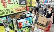 30일 서울 중구 봉래동 롯데마트 서울역점에서 직원들이 ‘통큰 TV’를 새로 들여놓고 있다. 롯데마트는 49만9000원인 기존 32인치 액정표시장치(LCD) TV 가격을 5만 원 내리고, 선착순 구매고객 1000명에게 스마트폰 ‘갤럭시S2’(2년 약정, 스마트 밸류 요금제 이용 시)를 나눠주기로 했다. 롯데마트 제공}