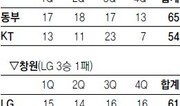 4위 동부가 단독 선두 KT를 꺾고 6연승을 질주하며 4라운드를 기분 좋게 마무리했다. 동부는 12일 부산에서 열린 KT와의 방문 경기에서 탄탄한 수비력을 앞세워 65-54로 승리했다. 연승을 이어가며 24승(12패)째를 거둔 동부는 3위 KCC와의 승차를 1경기로 좁혔다. 공동 선두가 된 KT와 모비스에도 2경기 차로 다가서 남은 5, 6라운드에서 상위 4팀의 순위 싸움은 한층 치열해지게 됐다. 동부는 올 시즌 평균 득점(78.8점)에 크게 못 미치는 점수를 올렸지만 맨투맨과 바꿔 맡기 등 수비가 잘 맞아 들어가면서 평균 득점 81.8점인 KT를 50점대에 묶어 완승을 이뤘다. 마퀸 챈들러가 양 팀 최다인 19점을 넣었고 김주성(12득점), 표명일(11득점), 윤호영(10득점)도 두 자릿수 득점을 기록했다. 동부는 올 시즌 KT와의 4차례 맞대결에서 3승 1패로 강한 면모를 보였다. 동부 강동희 감독은 “공격은 우리도 썩 잘하지 못했다. 수비가 지시한 대로 잘돼 이길 수 있었다”고 말했다. KT는 동부의 촘촘한 지역방어를 제대로 공략하지 못한 데다 야투 성공률도 38%로 저조해 제대로 힘 한번 써보지 못하고 무너졌다. 주득점원인 제스퍼 존슨(4득점)과 나이젤 딕슨(6득점)이 동반 부진한 것도 KT의 발목을 잡았다. 54득점은 KT의 올 시즌 한 경기 최소 득점이다. KT는 26승 10패. LG는 KT&G와의 창원 홈경기에서 61-50으로 이겨 올 시즌 팀 최다인 4연승을 달렸다. 혼혈 선수 문태영이 19득점 16리바운드로 공격과 수비에서 맹활약했다. 크리스 알렉산더도 10득점 12리바운드로 더블더블을 기록했고 11점을 넣은 이현준도 승리에 힘을 보탰다. 21승(15패)째를 올린 LG는 6위 삼성(16승 18패)과의 승차를 4경기로 벌렸다. KT&G는 전반을 34-29로 앞섰으나 후반 들어 16득점에 그치는 심한 공격력 부진으로 역전패했다. 2연패를 당한 7위 KT&G는 11승 24패.이종석 기자 wing@donga.com}