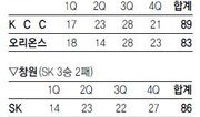 KCC의 최장신 센터 하승진은 지난달 30일 올스타전에 나섰다가 부상을 안고 있던 왼쪽 종아리 근육이 파열돼 전치 6주 진단을 받았다. 하승진의 공백은 적지 않았다. 그래서인지 최하위 오리온스를 어렵게 꺾었다. KCC가 하승진의 부상 공백에도 오리온스를 꺾고 30승 고지에 올랐다. KCC는 5일 대구실내체육관에서 열린 오리온스와의 방문 경기에서 89-83으로 이겼다. 최근 2연승을 달린 KCC는 30승(12패) 고지에 오르며 선두 모비스(31승11패)를 1경기 차로 뒤쫓았다. KCC는 모비스와 7일 울산에서 맞대결을 벌인다. 이번 시즌 들어 처음으로 하승진이 빠진 가운데 경기에 나선 KCC는 전반을 40-32로 앞섰고 4쿼터 중반에는 추승균과 전태풍, 아이반 존슨의 연속 득점을 묶어 76-65까지 달아나 손쉽게 승리를 거두는 듯했다. 하지만 연패에서 벗어나려는 오리온스의 저항도 만만치 않았다. 오리온스는 허일영의 자유투와 오용준의 속공, 3점슛이 연달아 터지며 종료 4분 57초를 남기고 74-76까지 바짝 따라붙었다. KCC가 추승균의 중거리포로 한숨을 돌리자 오리온스는 석명준의 3점 슛으로 1점 차까지 따라붙었다. 하지만 승부를 뒤집기에는 뒷심이 부족했다. KCC 임재현은 과감한 골밑 돌파에 이어 승부에 쐐기를 박는 3점 슛까지 터뜨려 승리를 지켜냈다. KCC는 존슨이 30점, 10리바운드로 하승진의 공백을 잘 메웠고 전태풍과 임재현이 각각 18점과 17점을 넣으며 뒤를 받쳤다. 창원에서는 SK가 LG를 86-73으로 따돌리고 단독 8위로 뛰어 올랐다. 전날까지 방문 9연패를 기록하던 SK는 28점을 몰아넣은 김민수와 방성윤(14점), 주희정(11점) 등의 활약을 앞세워 연패의 사슬을 끊었다. 홈 5연승에 도전했던 LG는 새 외국인 선수 레지날드 워렌이 6점, 8리바운드에 그치면서 연승 행진을 이어가는 데 실패했다. 이종석 기자 wing@donga.com}