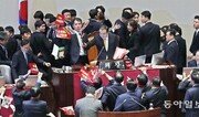 패스트트랙(신속처리안건)에 오른 선거법 개정안이 처리된 27일 국회는 선진화법 도입 전의 ‘동물국회’로 돌아간 모습이었다. 자유한국당 의원들이 문희상 국회의장이 본회의장 의장석에 앉지 못하도록 몸으로 막는 과정에서 본회의가 1시간 이상 지연되며 선진화법 도입 이후 본회의장에서 가장 격렬한 몸싸움이 벌어졌다. 가까스로 개의한 본회의에서 ‘4+1(더불어민주당·바른미래당 당권파·정의당·민주평화당+대안신당)’은 준연동형 비례대표제 도입을 골자로 하는 선거법 개정안을 통과시켰다. ○ 한국당 반발 속 5분 만에 선거법 처리 “재석 167명 중 찬성 156명, 반대 10명, 기권 1명으로 공직선거법 일부 개정 법률안 수정안의 가결을 선포합니다.” 문 의장은 선거법 개정안 상정 5분 만에 속전속결로 표결을 마치고 가결을 선포했다. 여야가 올 4월 패스트트랙 대전(大戰)을 시작한 지 약 9개월 만에 첫 번째 법안이 통과된 것. 한국당 의원들이 의장석 주변을 에워싸고 표결에 불참한 가운데 바른미래당 비당권파 의원 9명과 무소속 이정현 의원 등 10명이 반대표를 던졌고, 대안신당 천정배 의원이 기권했다. 한국당이 선거법과 고위공직자범죄수사처(공수처) 설치안에 대해 무기명 투표를 신청해 이를 두고 표결 방식에 대해 찬반 투표를 했으나 부결돼 투표는 기명으로 이뤄졌다. 한국당은 문 의장이 가결을 선포하자 의장석 앞에서 “민주주의는 죽었다” “이완용 (같은) 문희상”이라고 소리치며 강하게 반발했다. 한국당 의원들은 ‘독재가 시작됐다’ 등이 적힌 종이를 문 의장을 향해 수차례 집어던졌다. 문 의장은 항의하는 한국당 의원들을 향해 지친 표정으로 “문희상이 이미 죽었다. 허깨비만 남고 알맹이는 다 없어졌다”고도 했다. 한국당 이은재 의원은 질서유지권이 발동된 이후 국회 경위들과 몸싸움을 벌이다 허리 통증을 호소해 119 구급대에 이송됐다. 민주당 이재정 의원은 “(국회선진화)법이 우습냐”고 소리를 질렀고, 한국당 전희경 의원은 “우리를 다 잡아가라”고 응수했다. 의장석 점거와 회의 방해 금지 관련 처벌을 규정한 국회선진화법 시행 이후 처음으로 본회의장 의장석에서 몸싸움이 벌어진 것으로, 4월 패스트트랙 충돌에 이어 또다시 형사책임 논란이 벌어질 것으로 보인다. 한국당 의원들이 물리적으로 제지당한 이후 본회의장 민주당 의석에서는 정세균 국무총리 후보자와 의원들이 웃으며 기념촬영을 하기도 했다.○ “선거법으로 독재의 고속도로 깔려” 단식 후유증으로 병원에 입원 중인 황교안 대표는 선거법 통과 직후 페이스북에 “대한민국 민주주의가 죽었다. 그러나 국민 여러분과 함께 다시 살려내겠다”고 썼다. 심재철 원내대표는 본회의장에서 나와 “(바뀐 선거법은) 지역구에서 의석을 많이 얻은 정당이 비례 의석에서 불이익을 받기 때문에 평등 선거 원칙에 위배된다. 헌법소원을 내겠다”고 했다. 또 “문재인 대통령은 선거법에 대해 거부권을 행사하라. 대통령이 책임져야 한다”고 주장했다. 김성원 대변인은 논평에서 “결국 문재인 정부가 그토록 원하던 독재의 고속도로가 깔리고 말았다”고 했다. 한국당은 내년 1월 3일 광화문에서 문재인 정권 규탄 대규모 장외집회를 열 예정이다. 여야는 선거법 표결 전인 27일 오전에도 막판 여론전을 계속했다. 심 원내대표는 “위헌 선거법을 철회하라. 그러면 우리는 비례정당을 만들 필요가 없다”고 했다. 민주당은 한국당의 ‘비례한국당’ 계획이 오히려 위법 소지가 있다며 엄포를 놨다. 민주당 이인영 원내대표는 “중앙선거관리위원회에 정당법 위반 여부에 대한 검토를 요청하기로 했다”고 밝혔다. 한국당은 홍남기 경제부총리 겸 기획재정부 장관에 대해 제출한 탄핵소추안을 다시 제출하기로 했다. 앞서 한국당은 홍 부총리가 민주당의 예산안 처리에 동조한 것은 공무원의 중립 의무를 위반한 것이라며 국회에 탄핵소추안을 제출했지만, 72시간 내에 본회의에서 표결이 이뤄지지 않아 효력을 잃었다. 최고야 best@donga.com·강성휘 기자}
