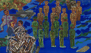잿빛 천이 전시장 벽 한쪽을 가득 메운다. 높이 4m, 폭 9m의 거대한 리넨의 한가운데에 깊숙한 터널이 있다. 무채색 화면 중앙의 붉은 사람들이 쏟아져 나올 것만 같다. 이 사람들을 향해 총알이 직선을 그리며 퍼붓는다. 마주하는 것만으로도 마음이 가라앉는 이 작품은 서용선 작가(68)의 신작 ‘노근리’다. 경기 파주시 아트센터 화이트블럭에서 서용선 개인전 ‘통증, 징후, 증세: 서용선의 역사 그리기’가 열리고 있다. 이번 개인전은 6·25전쟁을 중심으로 분단의 현실과 촛불집회, 대통령 탄핵 등 최근 사건까지 다룬 작가의 신작 회화와 드로잉, 설치 작품 등 100여 점을 선보인다. 작가는 단종의 죽음부터 시작해 임진왜란, 동학농민운동 등 역사적 사건 속 비극을 다뤄왔다. 이번 작품들은 특히 6·25전쟁에 초점을 두고 있다. 작가 개인에게 가장 밀접한 주제이기 때문이다. 전쟁 직후 서울에서 태어나 미아리 정릉 등지에서 작가는 어린 시절을 보냈다. 그가 다녔던 국민학교는 미아리 공동묘지가 철거된 자리에 세워진 것이었다. 당시 전쟁으로 사망한 사람이 많아지면서 미아리 공동묘지가 포화상태가 되자 망우리로 묘지 이전이 진행됐다. 미아리에 살았던 작가는 어린 나이에 그 과정을 모두 봤다고 한다. 운동장 한쪽에 뼈들이 쌓인 상황에서 수업을 하고, 학교 앞 산을 덮었던 어마어마한 공동묘지가 포클레인으로 파헤쳐졌다. 그런데 지금은 그 모습을 상상조차 할 수 없게 고층 아파트가 빽빽하게 들어섰다. ‘포츠담회담’ ‘포로’ 등 대작을 통해 작가는 문자로 기록되지 않는 인간의 감정과 역사의 맥락을 담아낸다. 이데올로기의 대립, 세대 간 격차, 지역 갈등 등 지금 우리 사회가 겪고 있는 문제의 실마리가 6·25전쟁에 있다는 목소리도 느껴진다. 전시장 3층에서 볼 수 있는 ‘제3의 선택, 김명복’은 6·25전쟁 당시 의용군으로 끌려갔다가 한 달 만에 포로로 잡혀, 제3국을 선택해 브라질에서 60여 년을 산 김명복 씨의 초상을 담는다. 전시는 12월 8일까지.김민 기자 kimmin@donga.com}